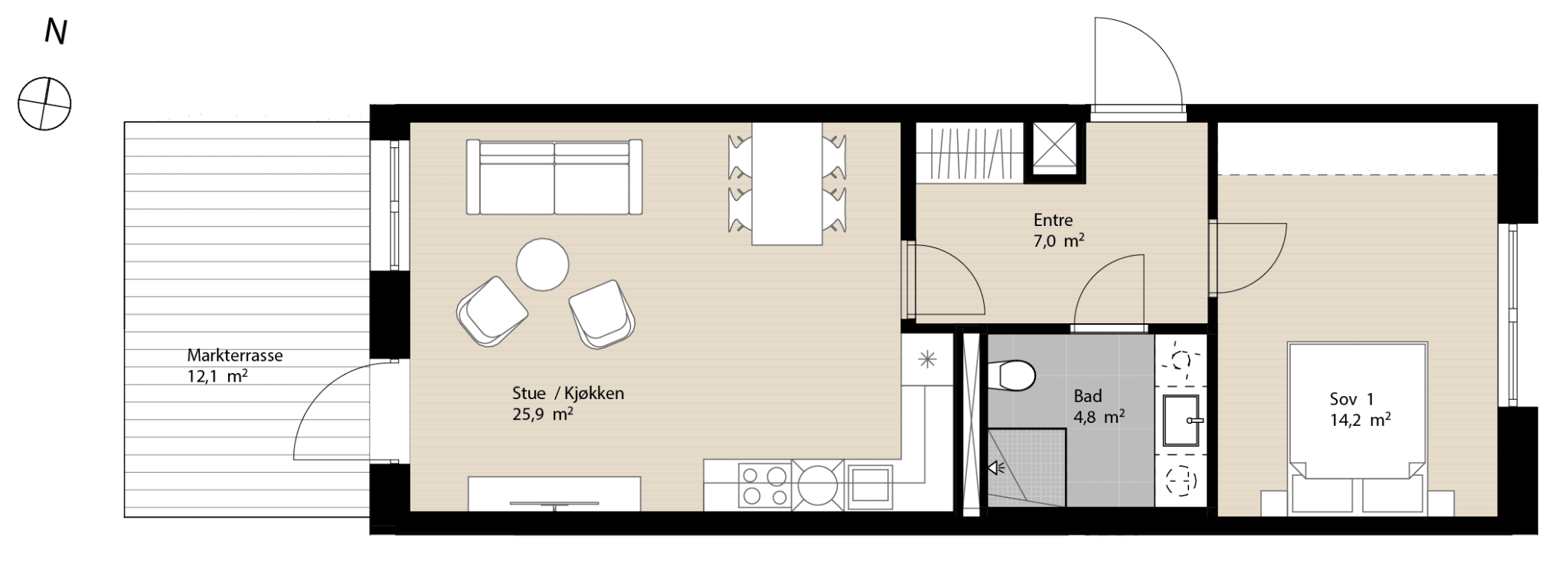 Leiligheten har en fin planløsning som føles lys og romslig. Soverommet har god plass til stor garderobe, og den åpne stue- og kjøkkendelen er lett og logisk å møblere.