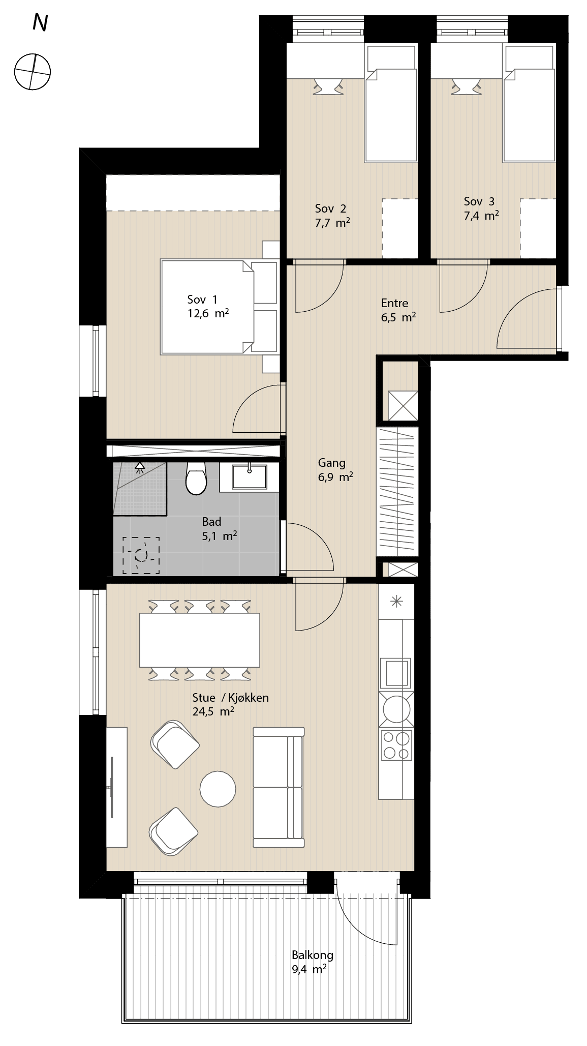 En perfekt leilighet til småbarnsfamilien. Her er det to ganske like soverom, ett til hvert av barna. Mens mor og far får det romslige hovedsoverommet. Leiligheten ligger på enden, og har dermed vinduer og lys inn fra tre kanter.