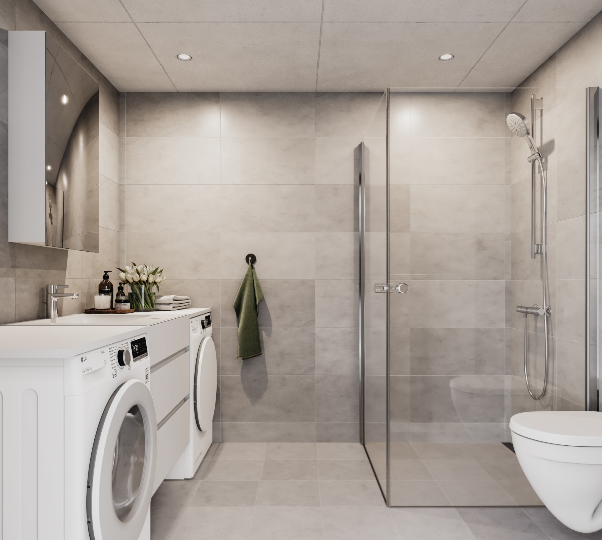 Det blir også fine leggerutiner på det deilige flislagte badet. Gulvvarme og praktisk dusjhjørne gjør at kveldsstellet blir lystbetont.