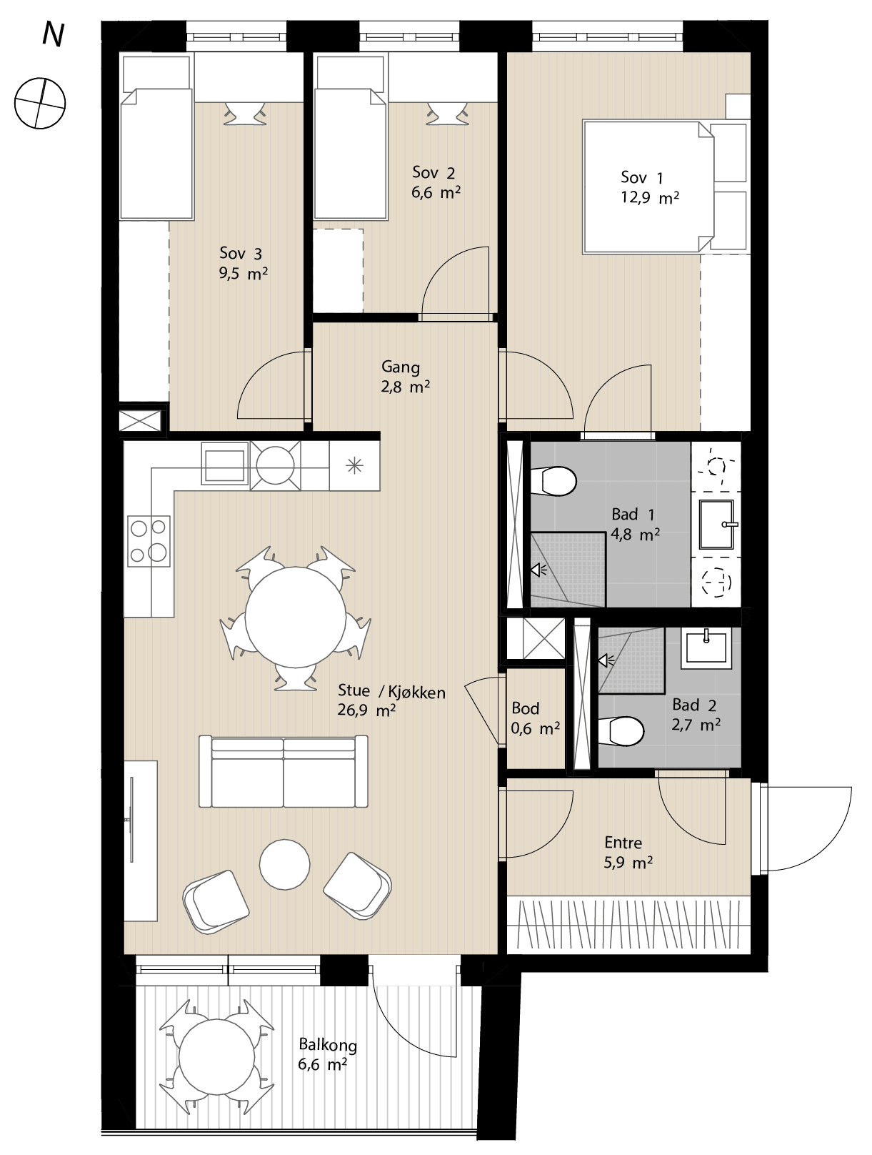 Leiligheten er gjennomgående, noe som gjør at både de tre soverommene og den åpne stue- og kjøkkenløsningen vil få godt innslipp av dagslys. Kjøkkenhjørnet har innredning fra HTH, og har godt med benkeplass. Alle hvitevarer er inkludert og integrert. Her er også god plass til både en spisestue og salong foran TVen.