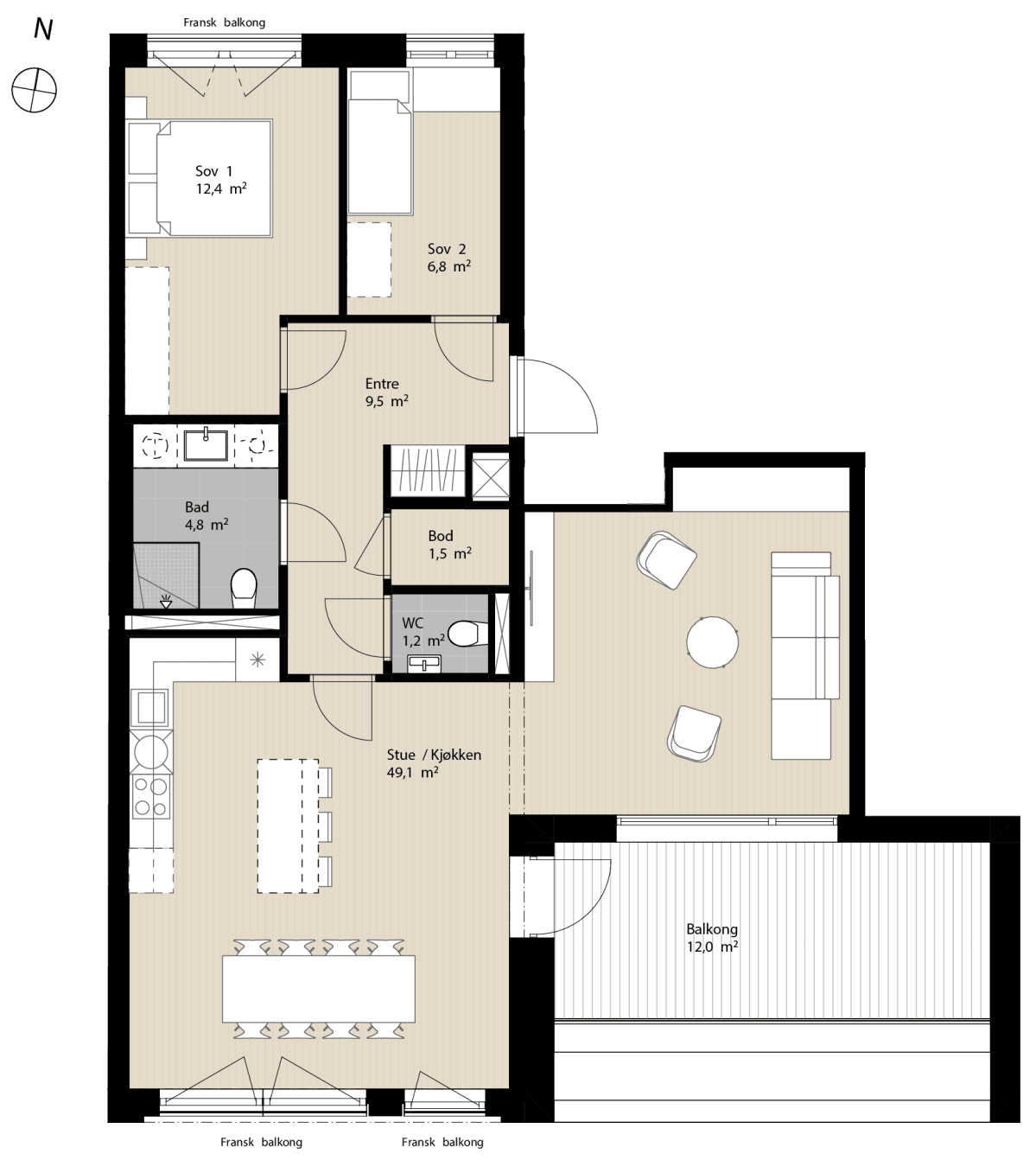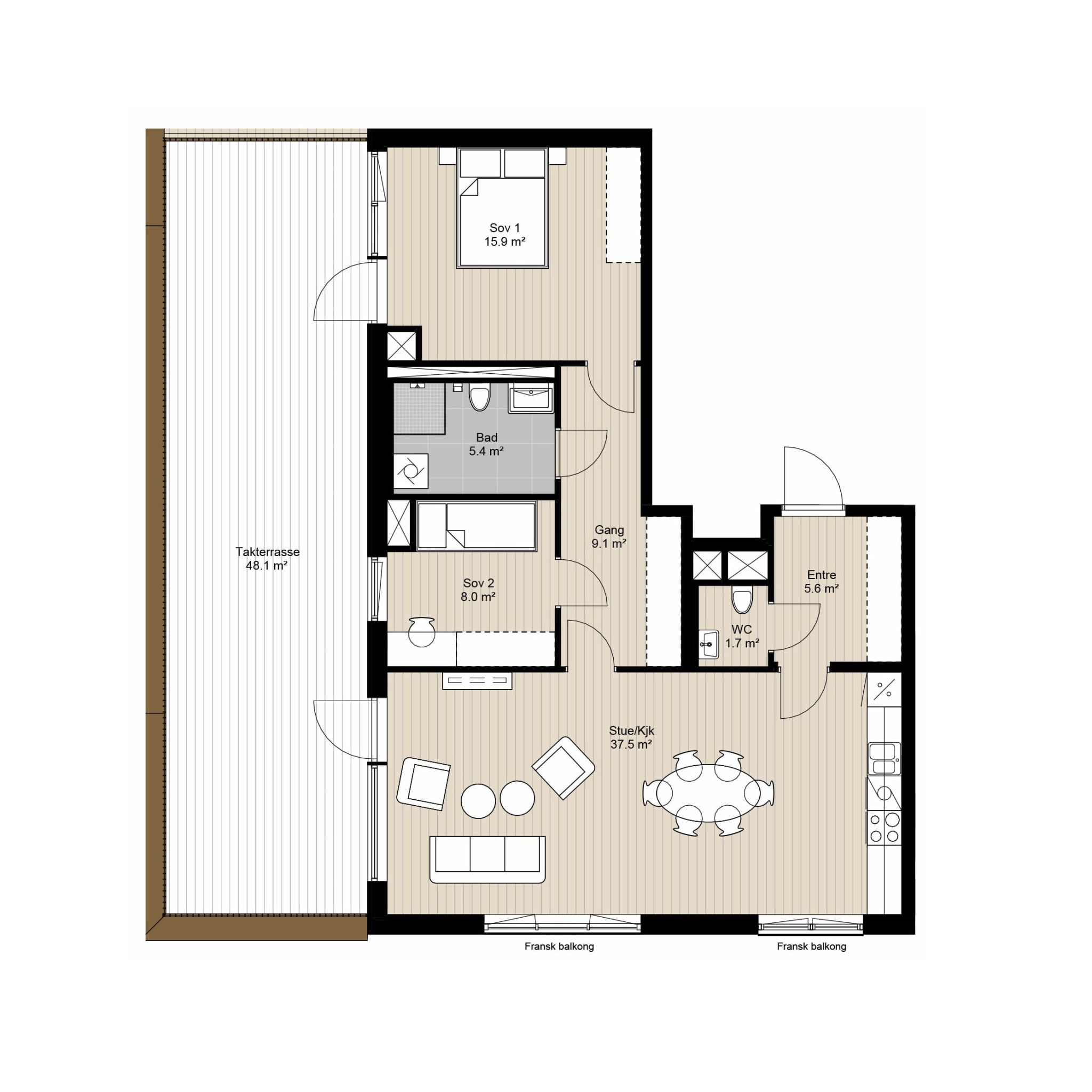 Nedenfor viser vi noen eksempler på noen av 3-roms leilighetene vi har til salgs i Fredheimkvartalet. Vi har også flere varianter, så ta gjerne en titt i boligvelgeren dersom du vil se flere objekter.