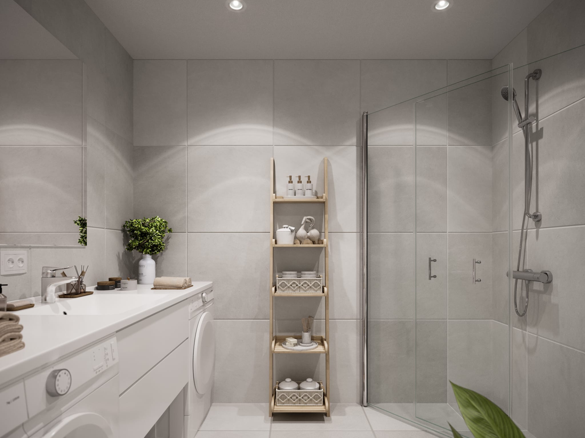 Det er flislagte bad med deilig gulvvarme og lekre baderomsmøbler.