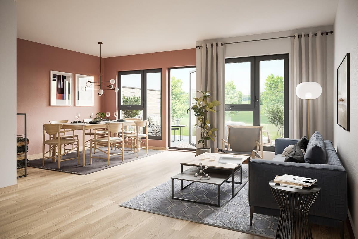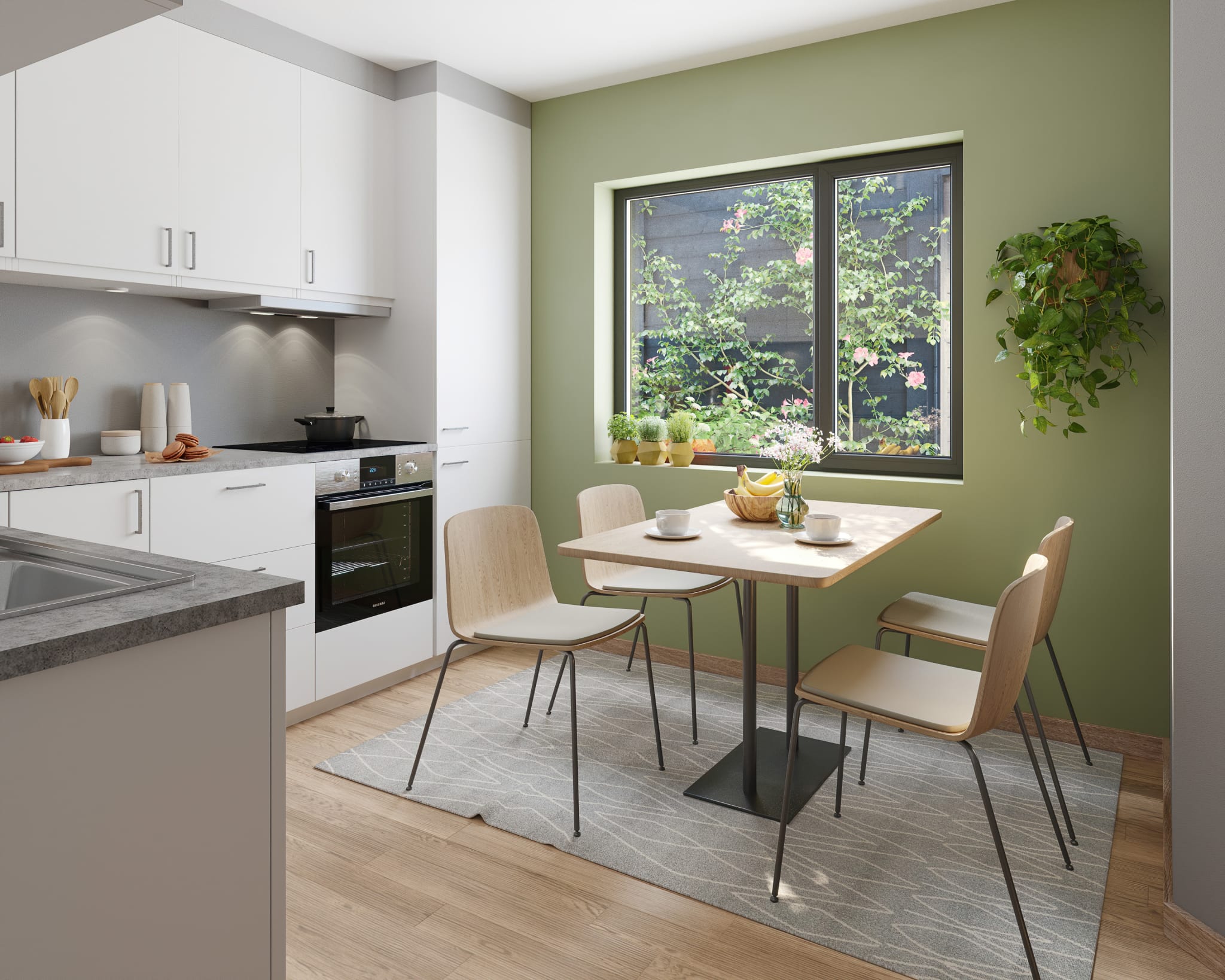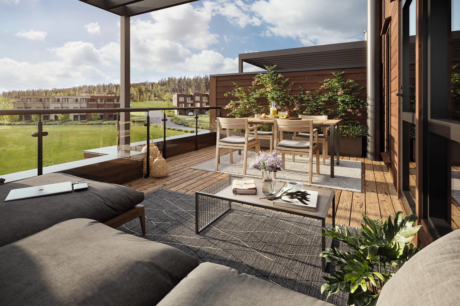 Sykkelparkering og to gode verandaer på 12,0 og 7,5 m2. Åpen stue og kjøkkenløsning over et helt plan gir boligen en god luftig følelse av stor plass.