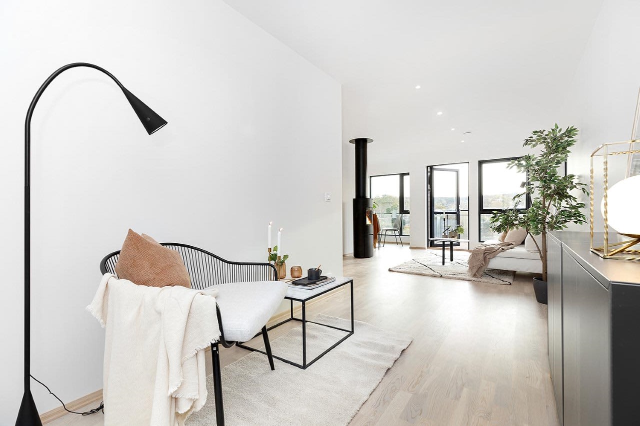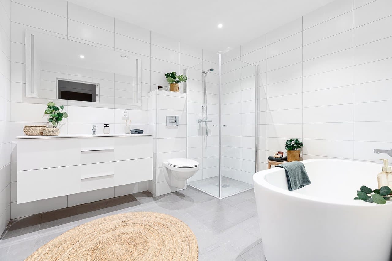 Boligen har to delikate flislagte bad, hvor det ene innehar badekar. Utgang til balkong fra stue.