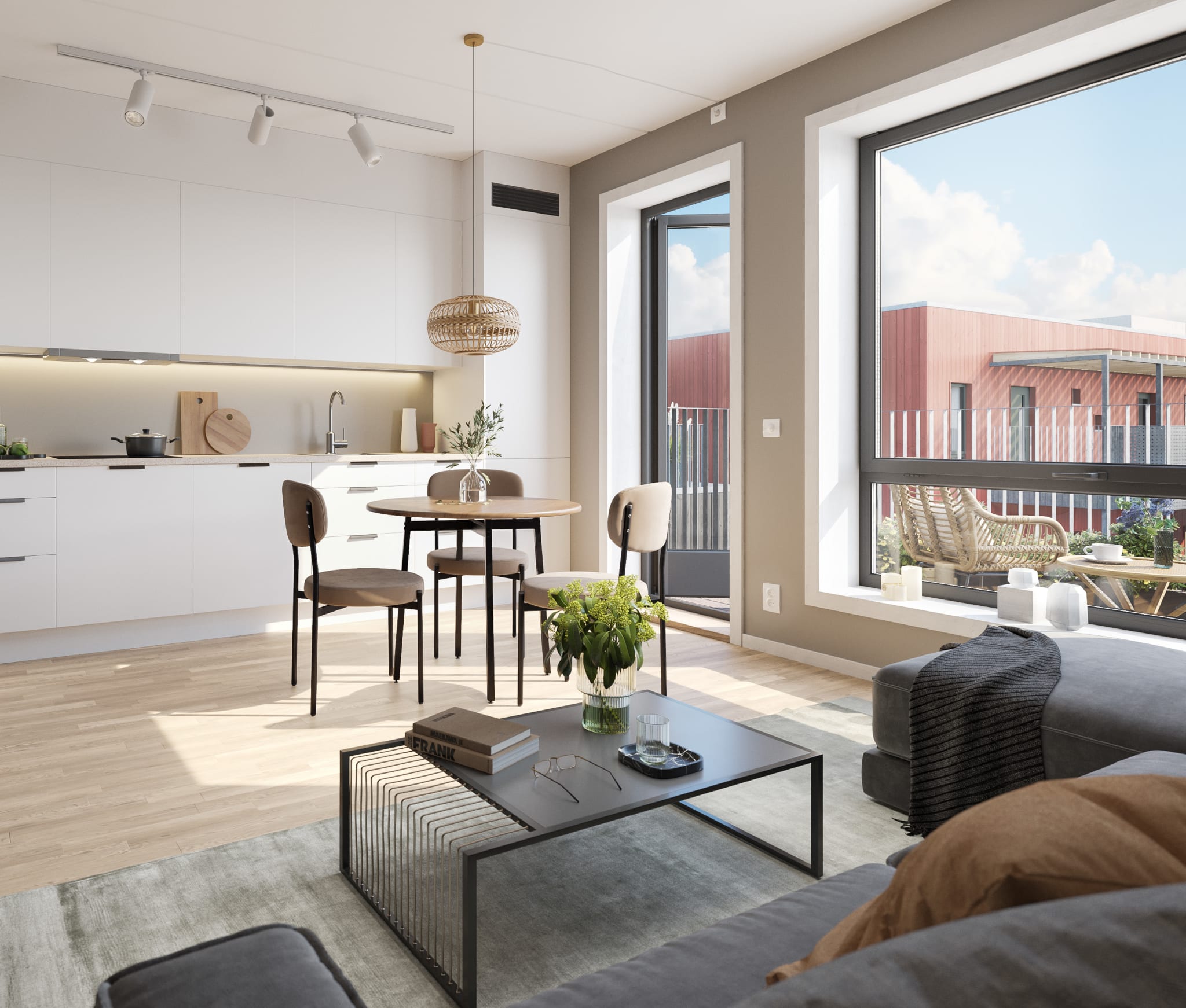 Vi har prioritert gode, store oppholdsrom, med takhøyde på opp til 2,5 m. De fleste leiligheter har også sone- inndelt stue og kjøkken, noe som tilrettelegger for en mer fleksibel bruk.