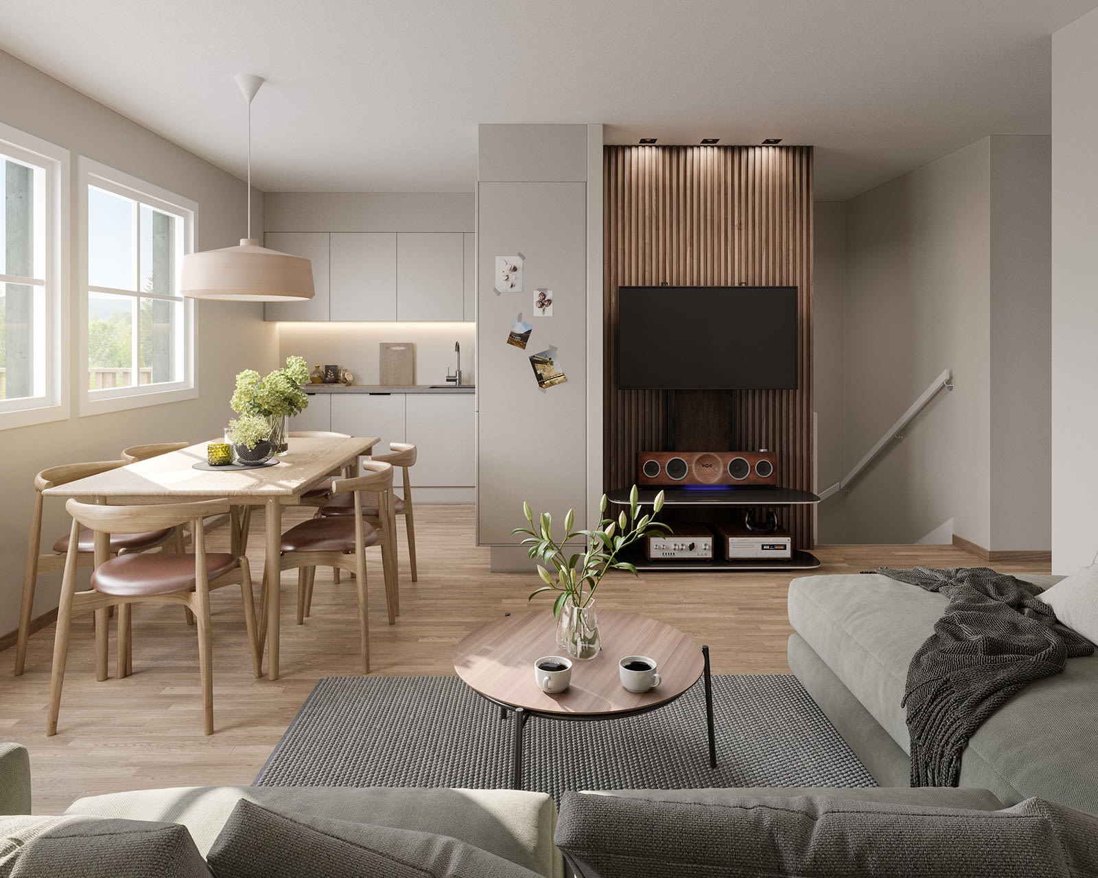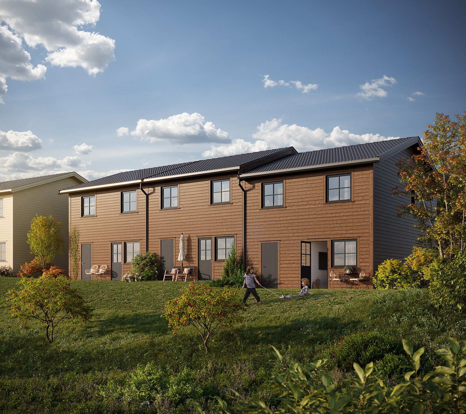 Rekkehusene får 3 soverom, lys stue med åpen kjøkkenløsning, privat, solrik og romslig uteplass – perfekt for både barnefamilier, par og deg som ønsker en praktisk og moderne bolig.