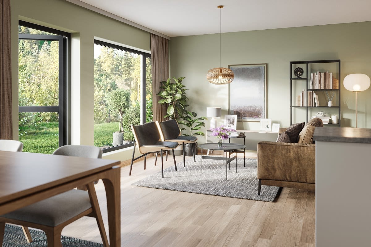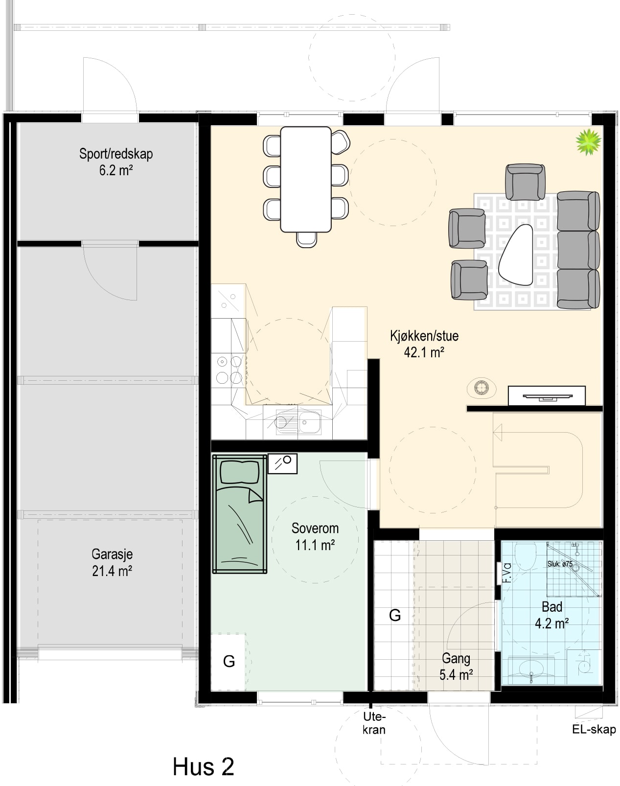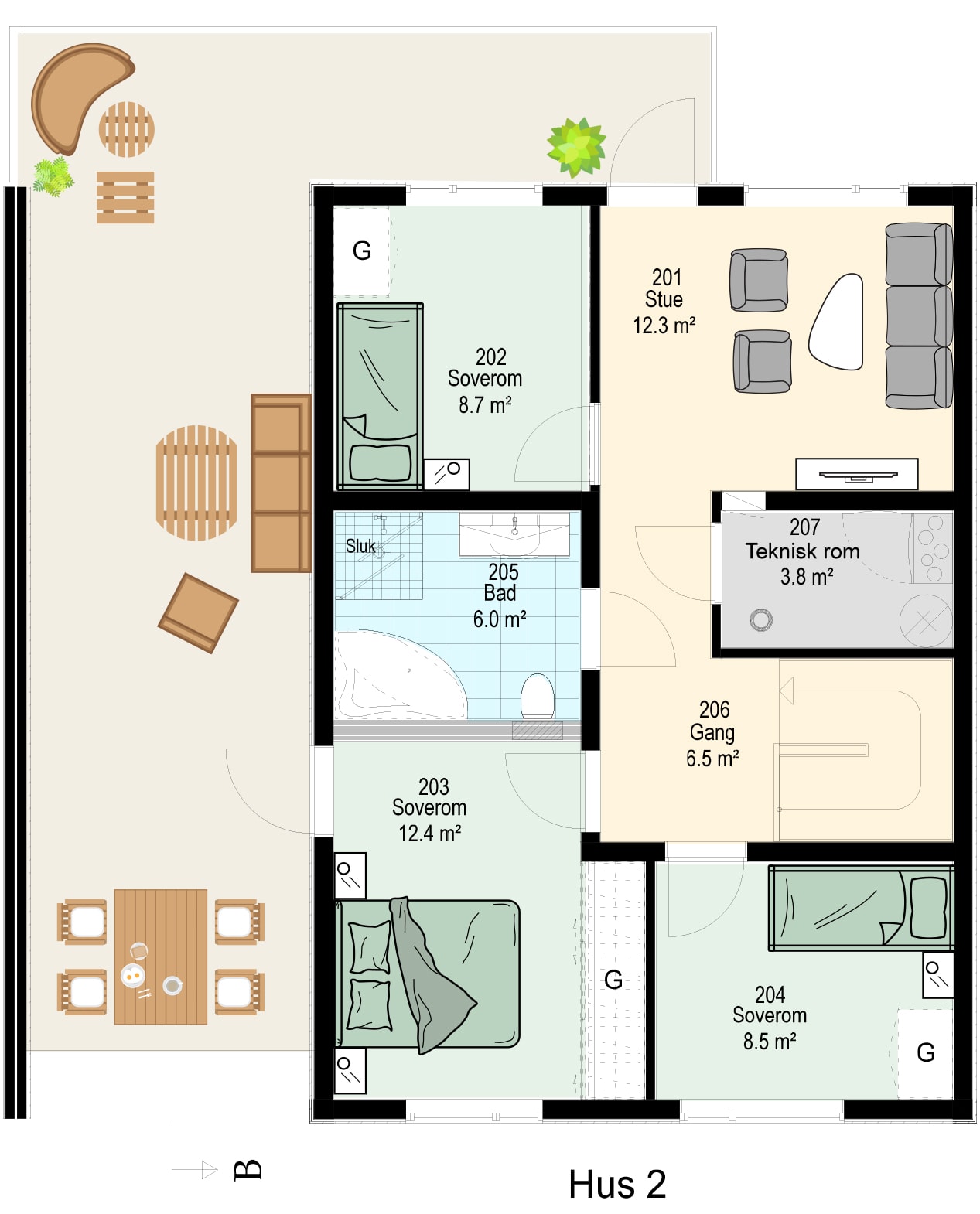 Her får du gode oppbevaringsmuligheter med innvendig og utvendig bodplass. Solen kan nytes fra den herlige takterrassen, som er på hele 42 kvm!