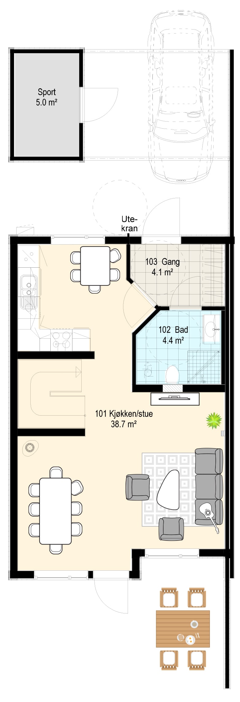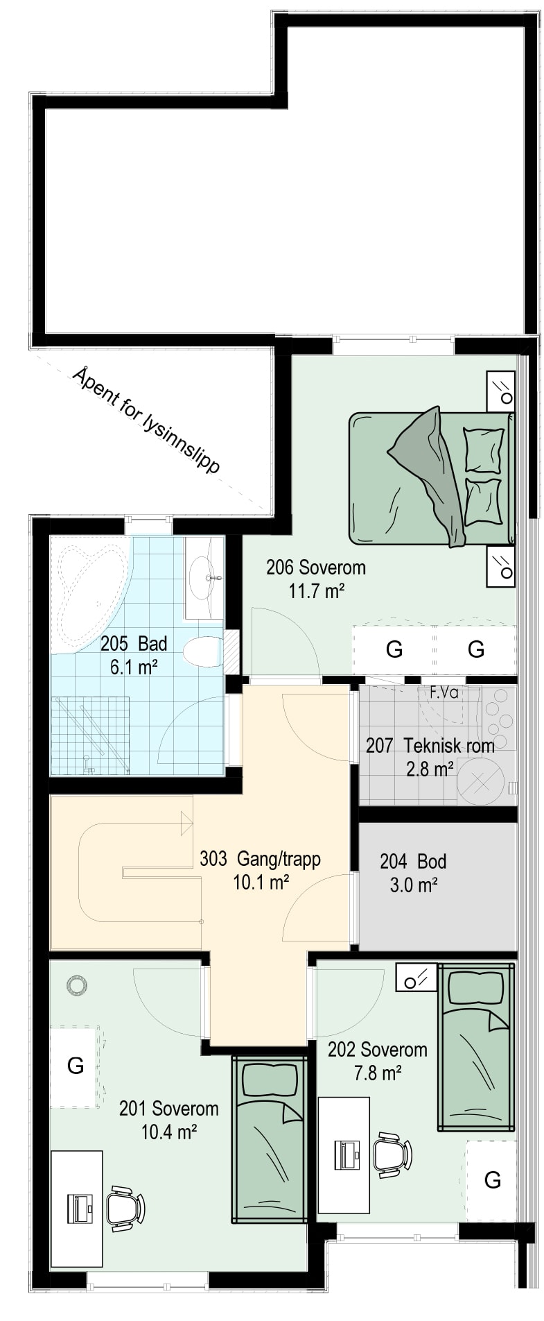En ny effektiv boligmodell med 3 soverom på samme flate, samt praktisk bodløsning både ute og inne.