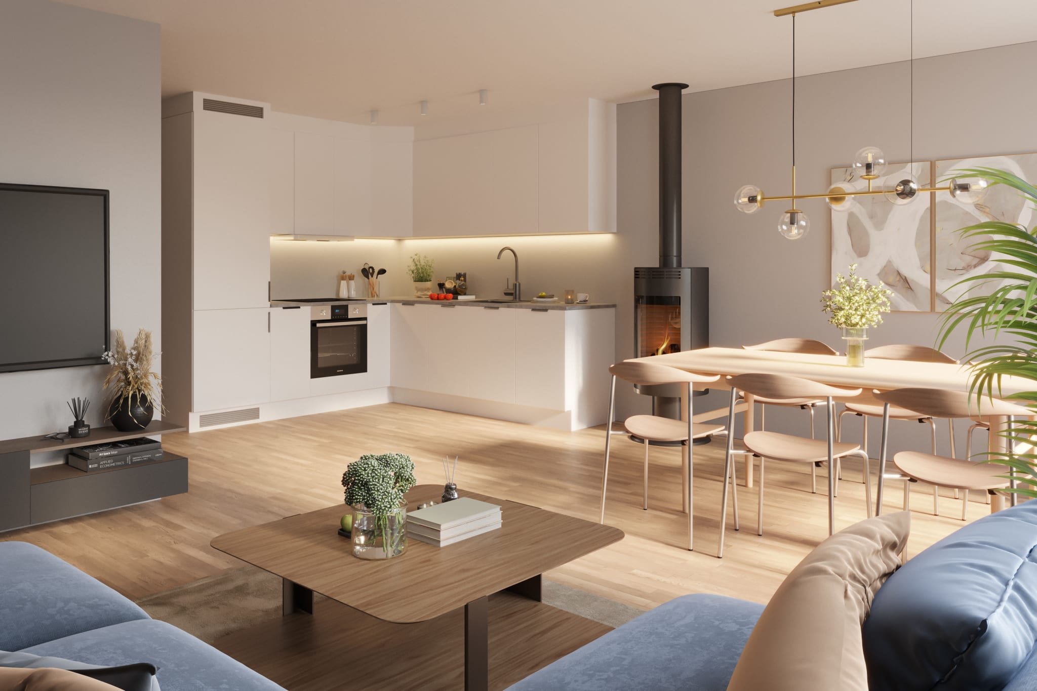 En fin og praktisk bolig over to plan med hele 4 soverom, hvor alle er på samme flate. Loftsstue og pent flislagt bad i hver etasje. I denne boligen får du integrert garasje med praktisk sportsbod i bakkant. Det er også gode oppbevaringsmuligheter med innvendig bod og walk-in-closet tilknyttet hovedsoveommet. Den trivelige peisovnen i første etasje skaper varme og hygge. Velkommen til Elvegård, en trivelig boligmodell.