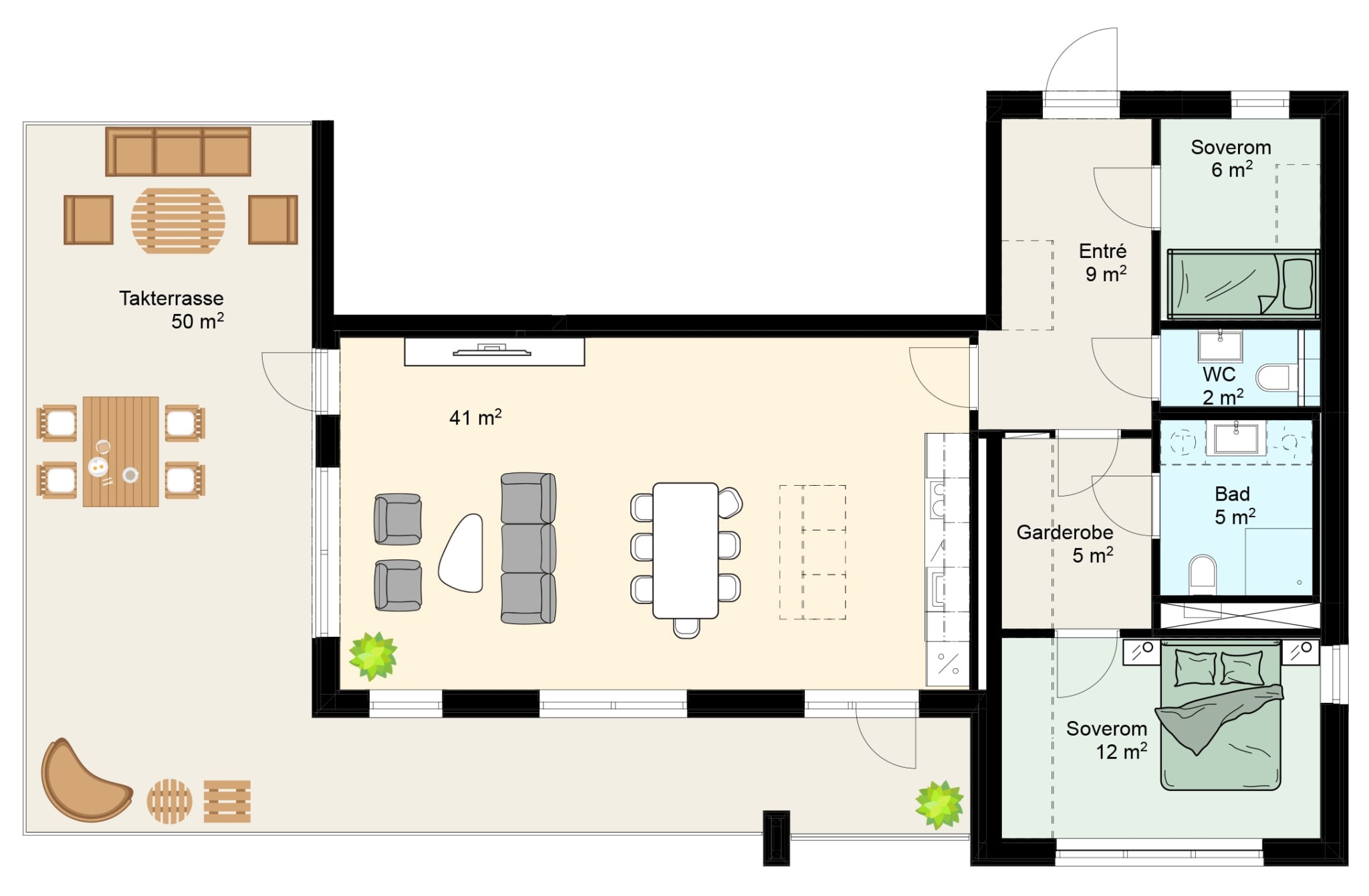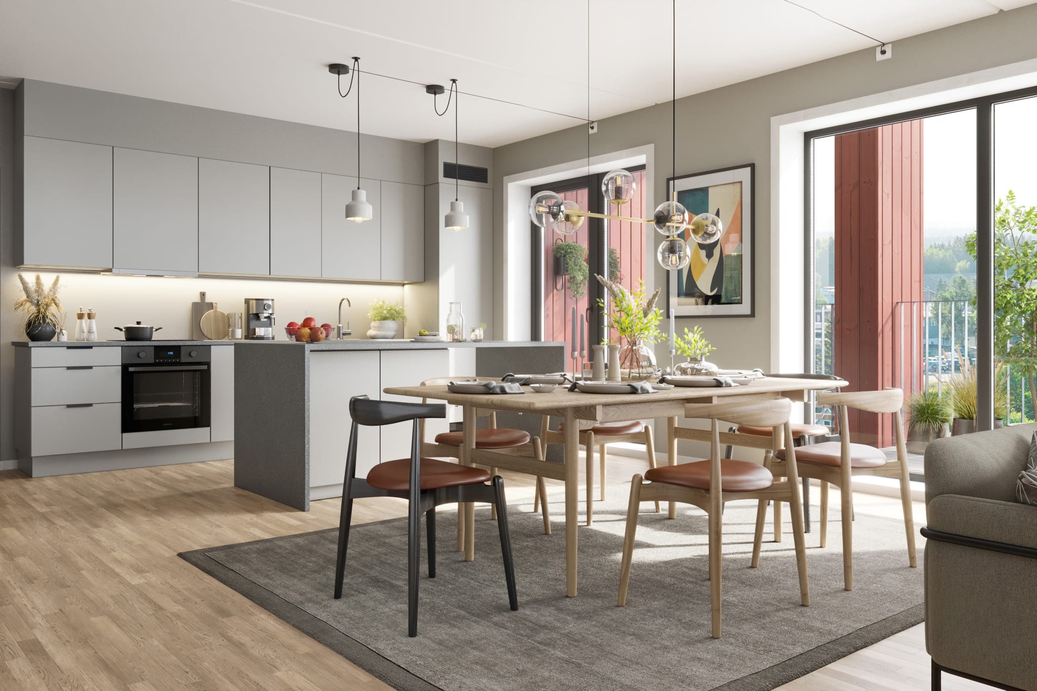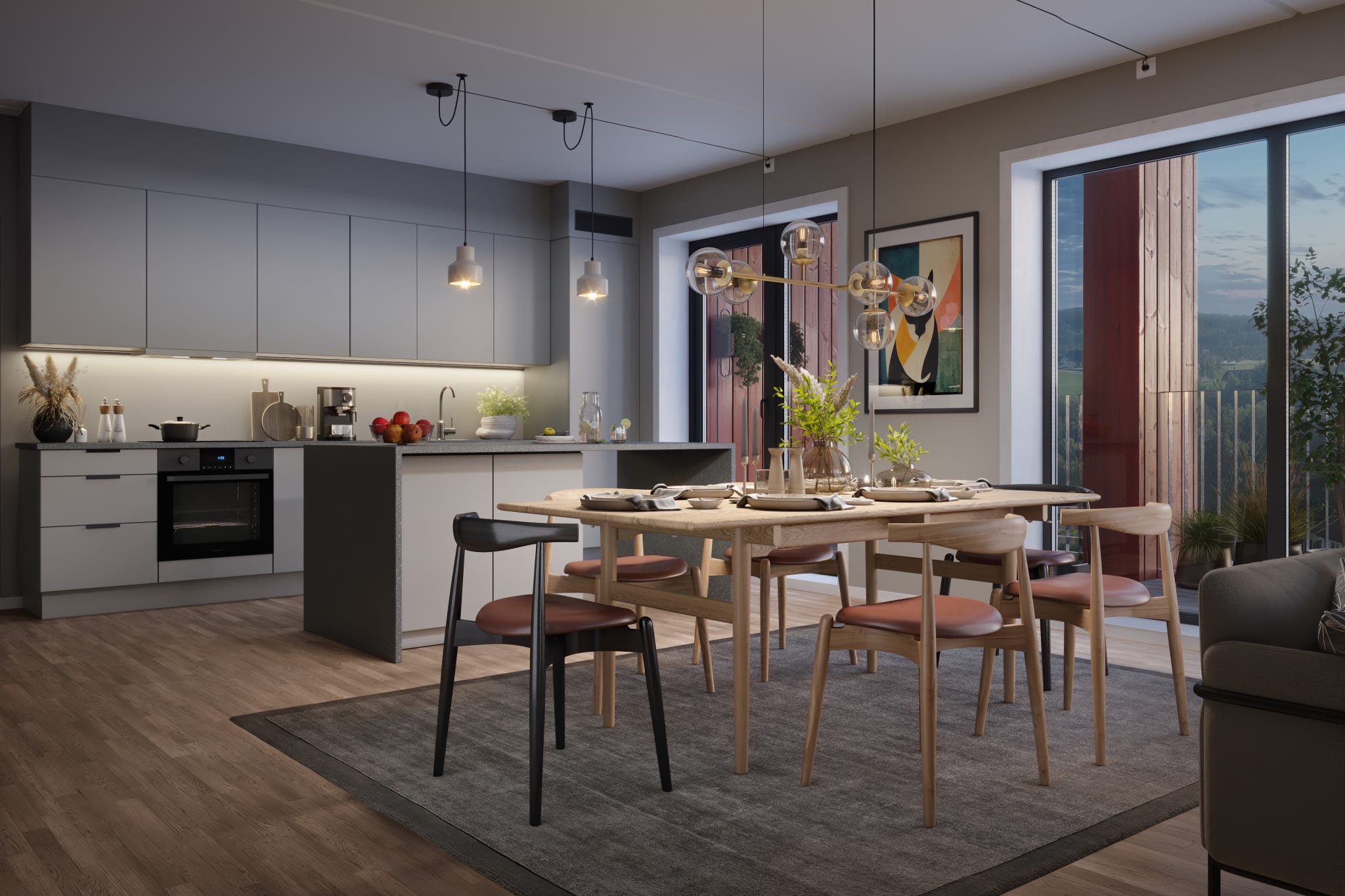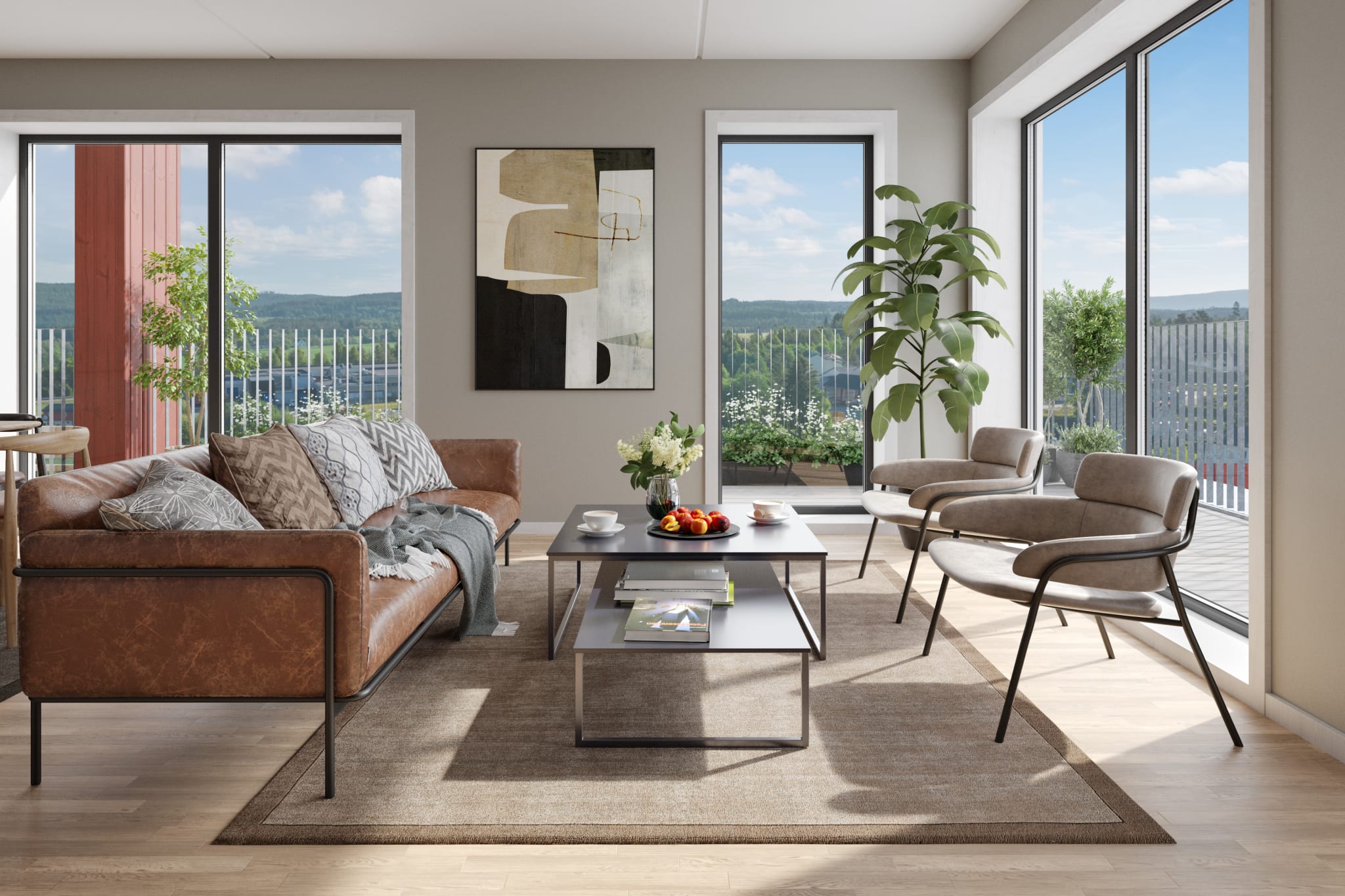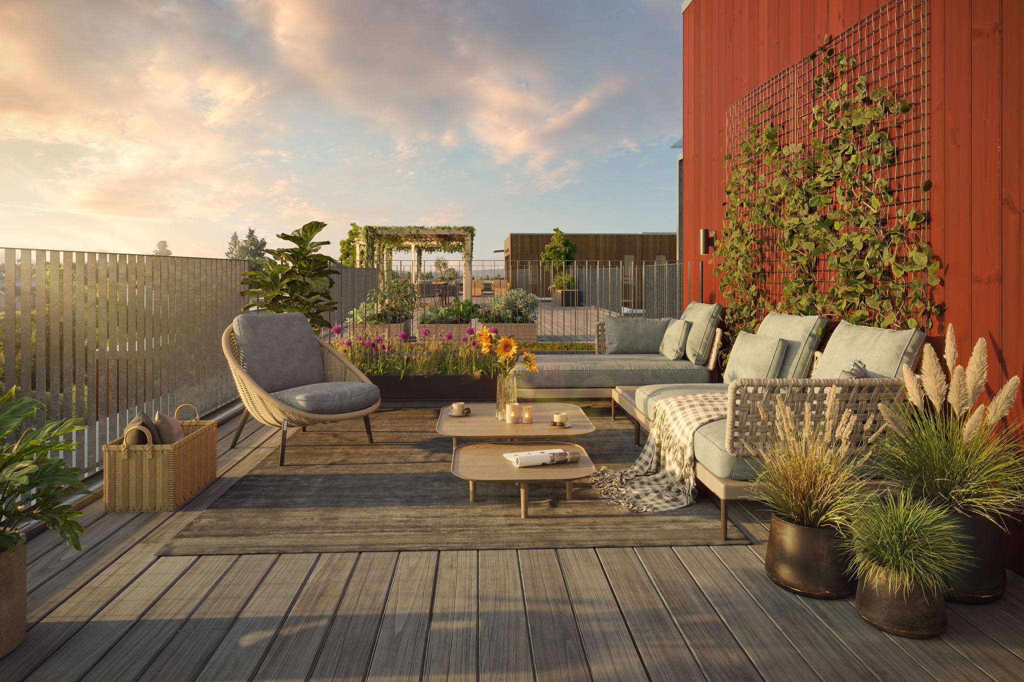 En lys og romslig leilighet med stor privat takterrasse. Her får du to soverom der hovedsoverommet ligger i egen fløy med eget bad og praktisk garderobeløsning. Det er åpen stue-kjøkkenløsning som gir en god og luftig romfølelse. Herfra har du to utganger til stor privat takterrasse som går i vinkel rundt bygget. På gulvet ligger en lys og fin 3-stavs, hvitpigmentert eikeparkett og det er behagelig gulvvarme i alle oppholdsrom. Skap din drømmebolig med tre ulike stilpakker.