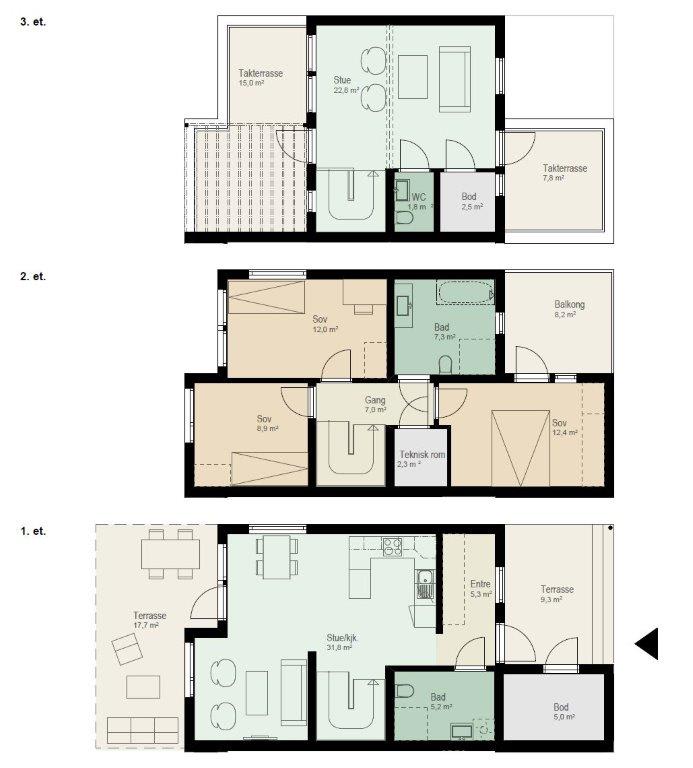 Boligen har en romslig loftsstue – perfekt som TV-stue, hjemmekontor eller ungdomsrom – og herfra har du utgang til takterrasser i begge himmelretninger. Sol og luft rett utenfor din egen stuedør. Her vil alle finne sin favorittplass.