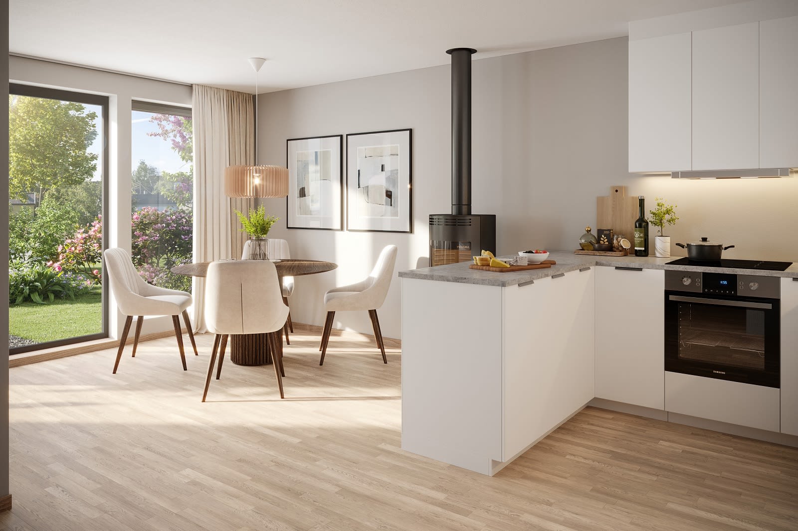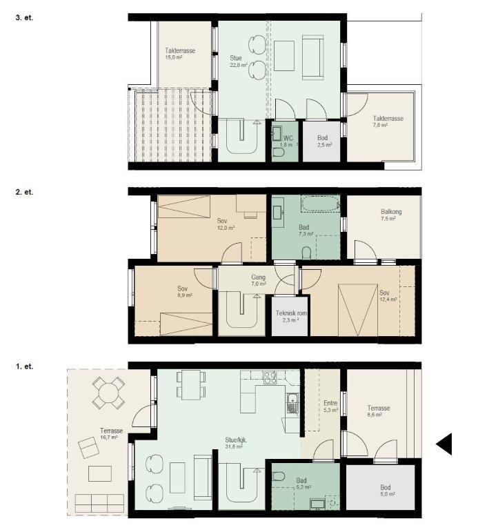 Boligen har en romslig loftsstue – perfekt som TV-stue, hjemmekontor eller ungdomsrom – og herfra har du utgang til takterrasser i begge himmelretninger. Sol og luft rett utenfor din egen stuedør. Her vil alle finne sin favorittplass.
