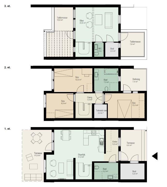 Denne innholdsrike boligen byr på en gjennomtenkt planløsning tilpasset både hverdag og hvile. Med tre soverom, åpen kjøkken- og stueløsning, samt bad og WC i alle etasjer, er dette et hjem som kombinerer funksjonalitet med moderne komfort.