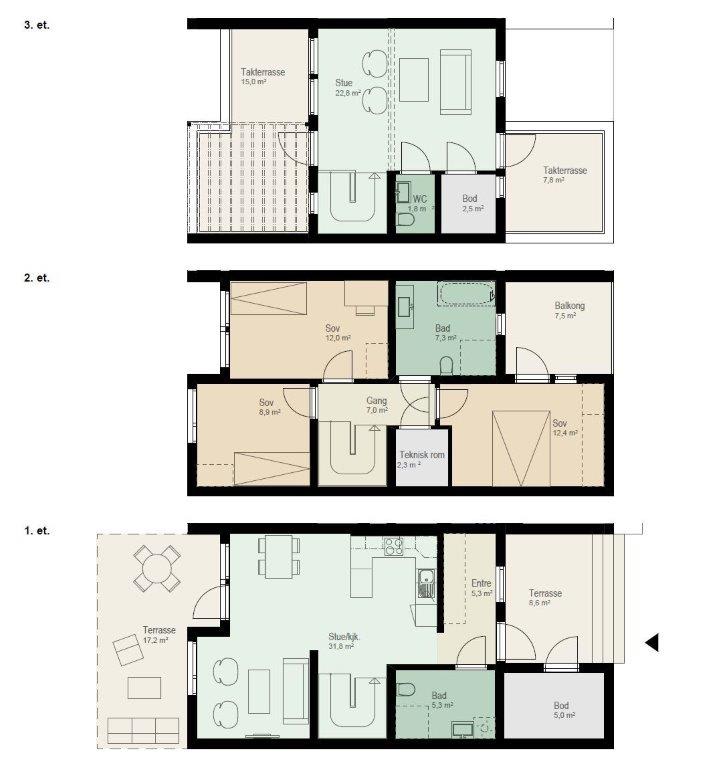 Boligen har en romslig loftsstue – perfekt som TV-stue, hjemmekontor eller ungdomsrom – og herfra har du utgang til takterrasser i begge himmelretninger. Sol og luft rett utenfor din egen stuedør. Her vil alle finne sin favorittplass.