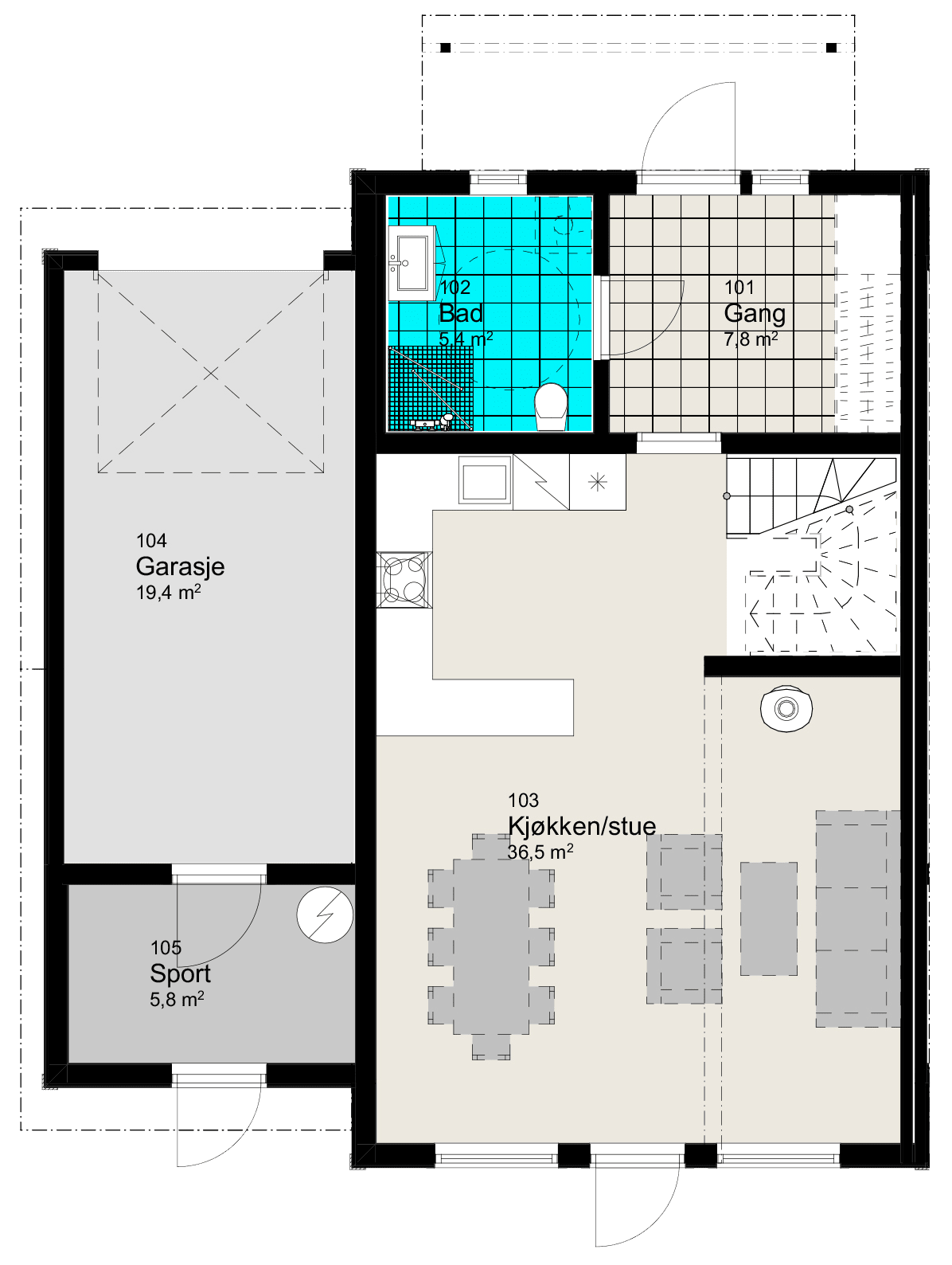 Boligen har en åpen og romslig kjøkken-/stueløsning på 35,5 m², med utgang til hage og gode lysforhold. Boligen har garasje og sportsbod i direkte tilknytning til boligen – praktisk og funksjonelt.