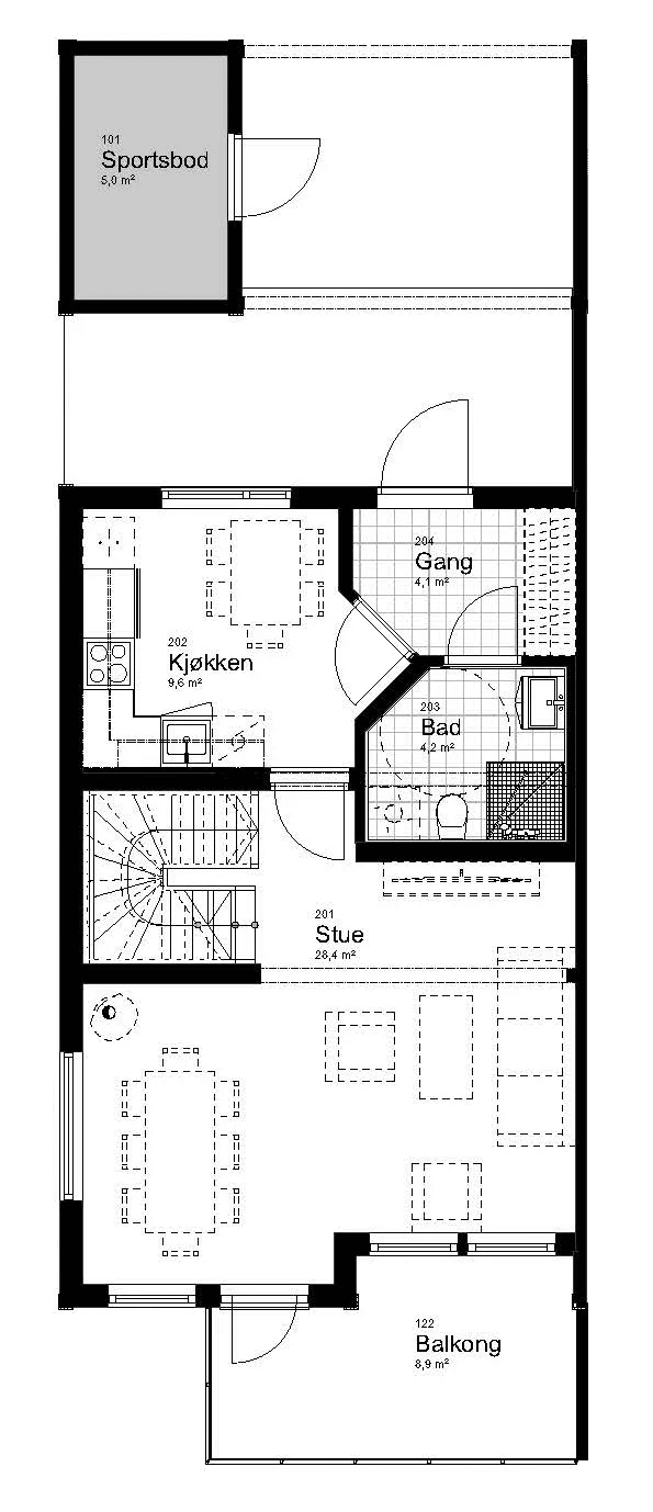 Denne trivelige tomannsboligen, med fire soverom og to separate bad, tilbyr god plass for hele familien. Store glassflater slipper inn rikelig med naturlig lys, og solrike uteplasser i alle himmelretninger gir mulighet for å nyte solen hele dagen. Boligen har separat stue og kjøkken, samt en loftsstue som gir alle i husstanden et eget sted å trekke seg tilbake. Leveransen er komplett og nøkkelferdig, inkludert peisovn og et moderne HTH-kjøkken med integrerte hvitevarer.