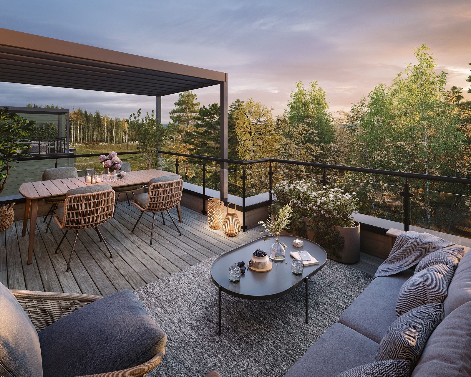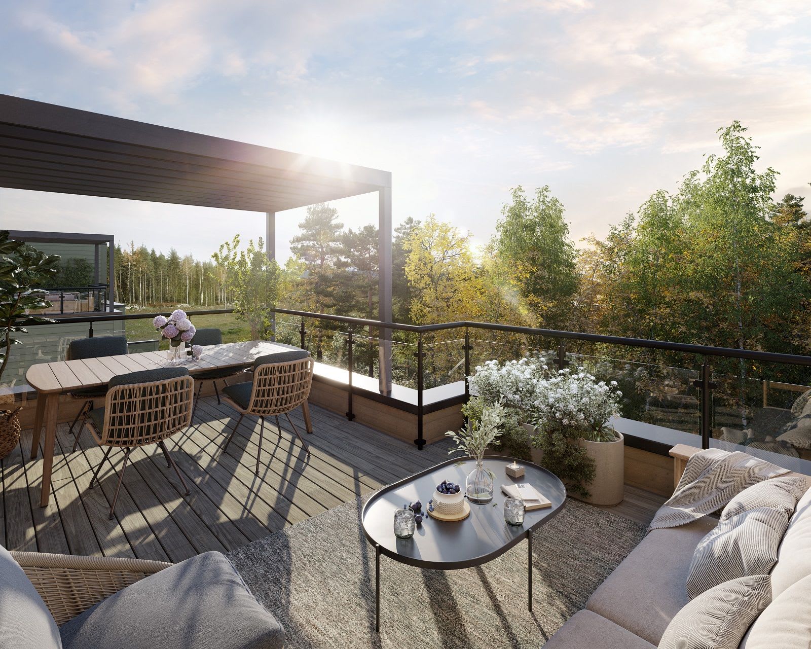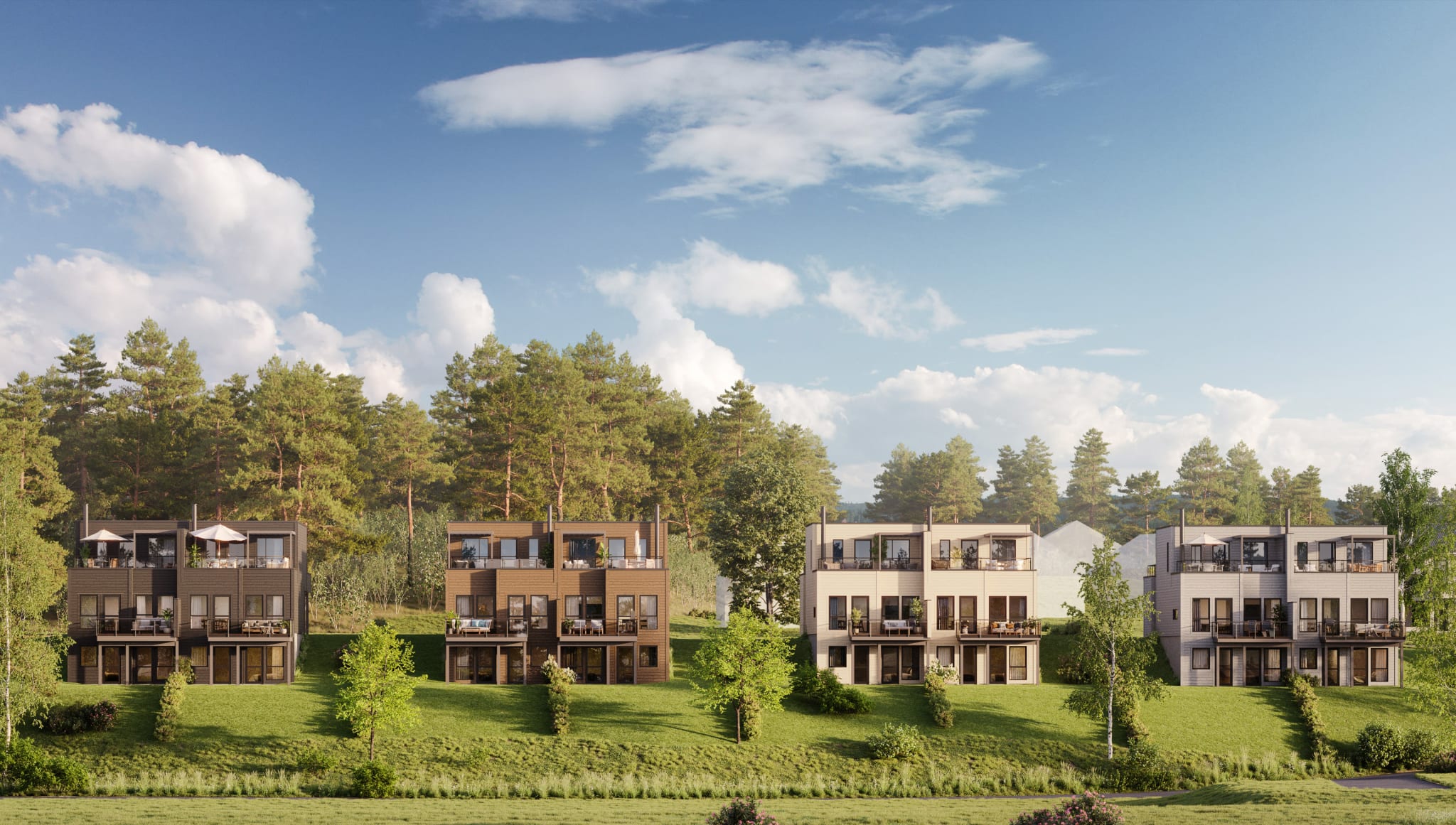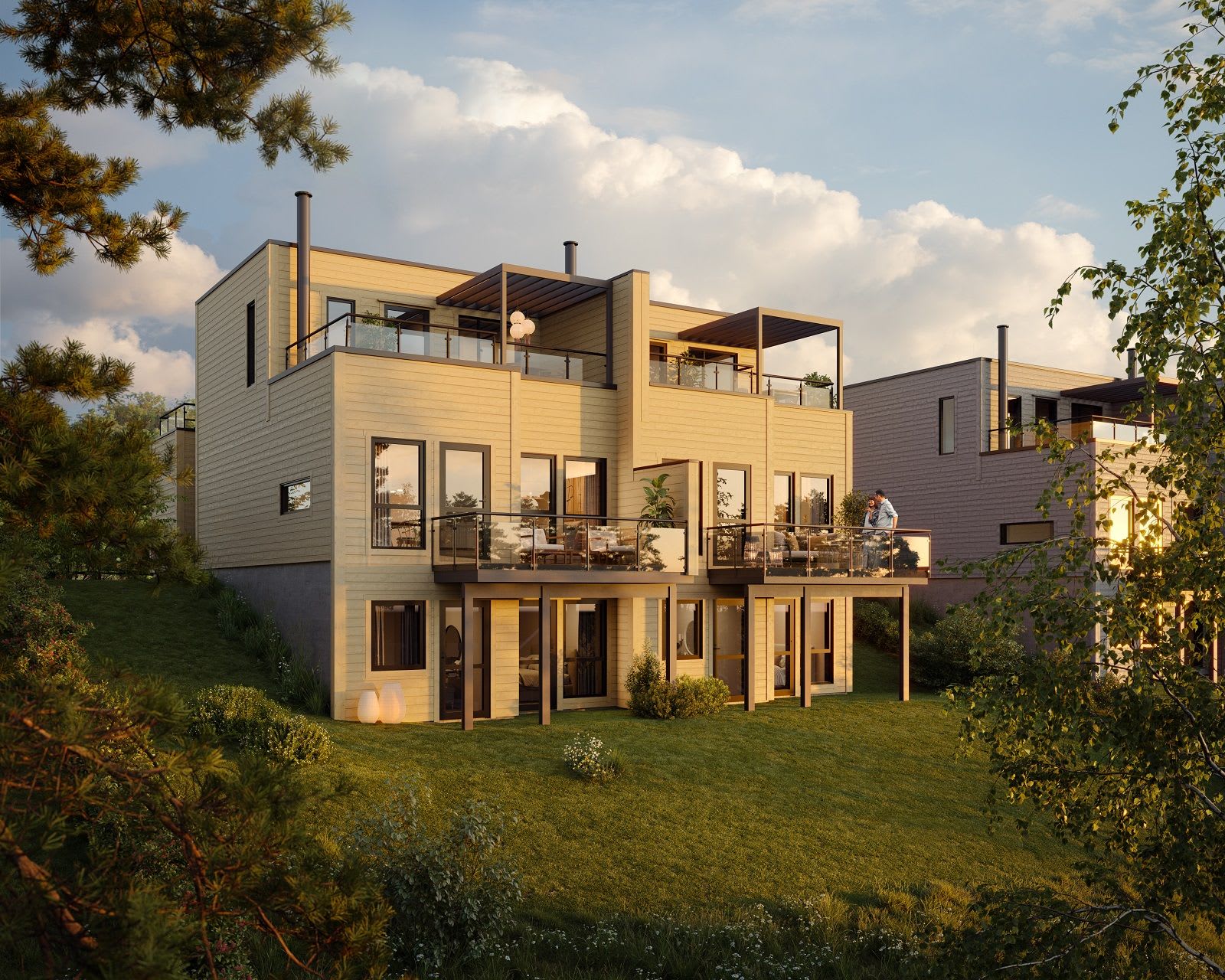 Denne trivelige tomannsboligen, med fire soverom og to separate bad, tilbyr god plass for hele familien. Store glassflater slipper inn rikelig med naturlig lys, og solrike uteplasser i alle himmelretninger gir mulighet for å nyte solen hele dagen. Boligen har separat stue og kjøkken, samt en loftsstue som gir alle i husstanden et eget sted å trekke seg tilbake. Leveransen er komplett og nøkkelferdig, inkludert peisovn og et moderne HTH-kjøkken med integrerte hvitevarer.