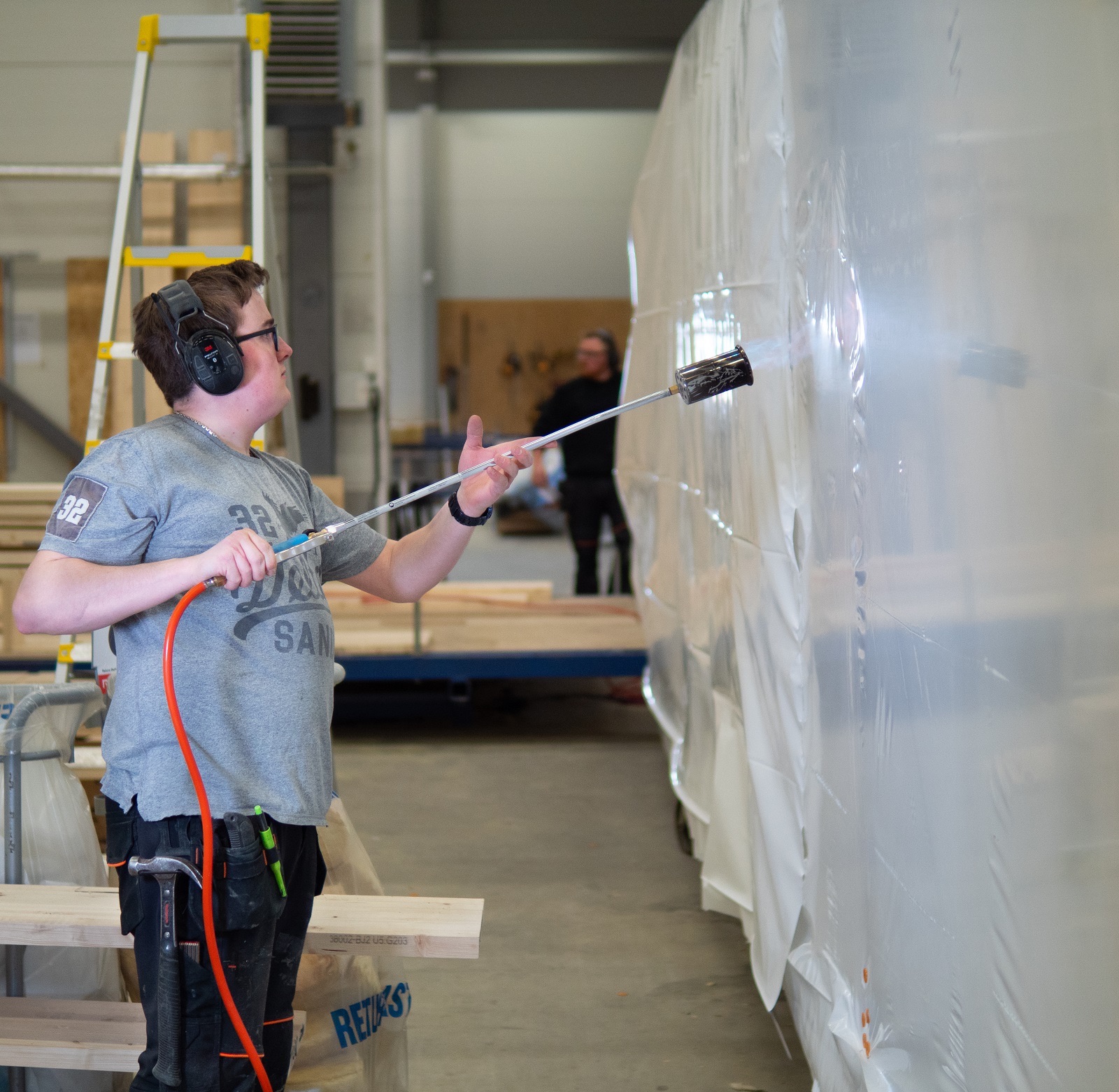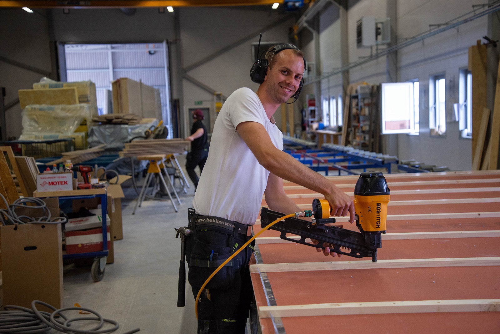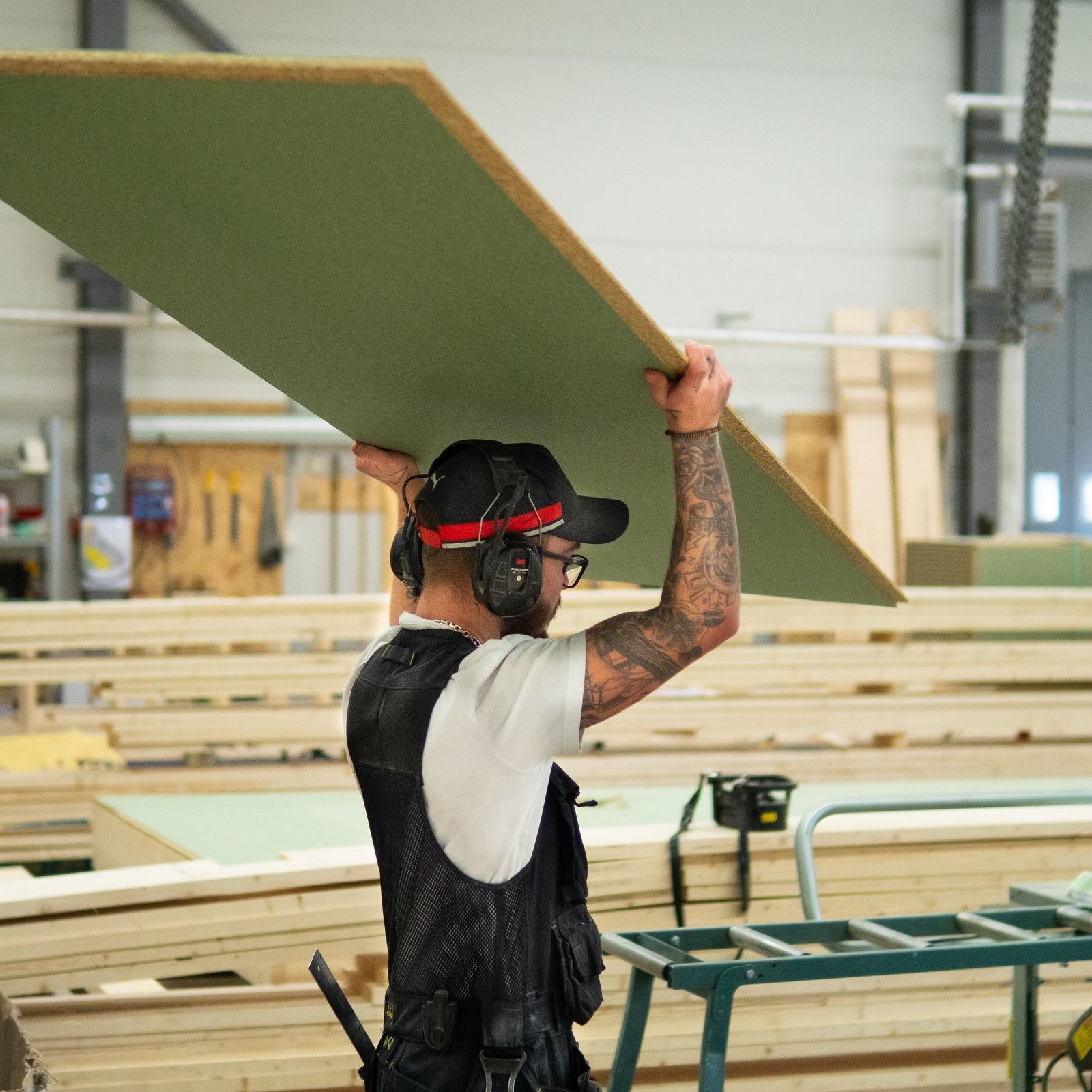 Huselementene i produksjonen er ferdige til montering når de leveres på byggeplass, ergo blir det nærmest ikke et eneste kapp til overs. I vår elementproduksjon er vi opptatt av å optimalisere husproduksjonen og oppnå best mulig materialutnyttelse for å unngå svinn.