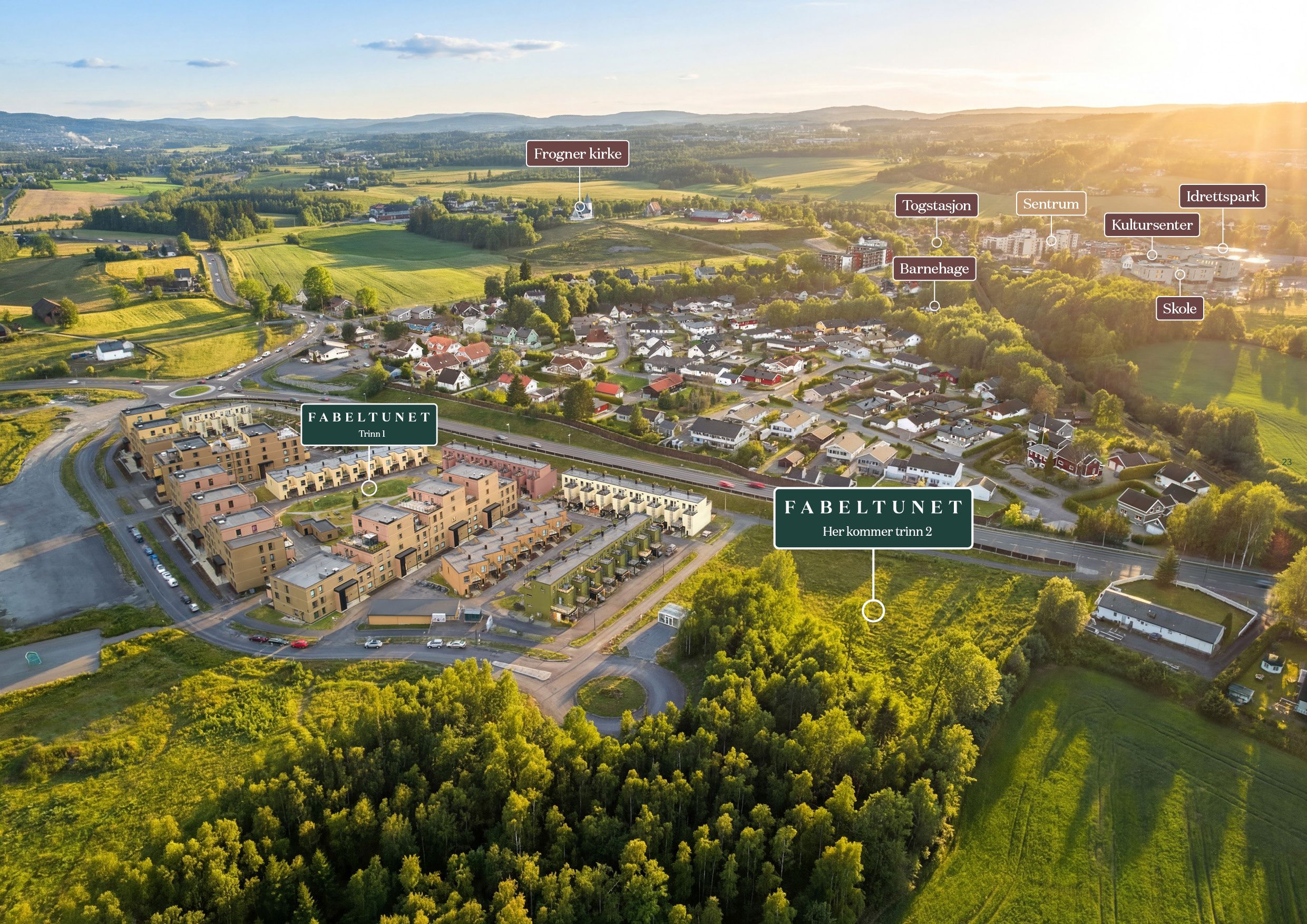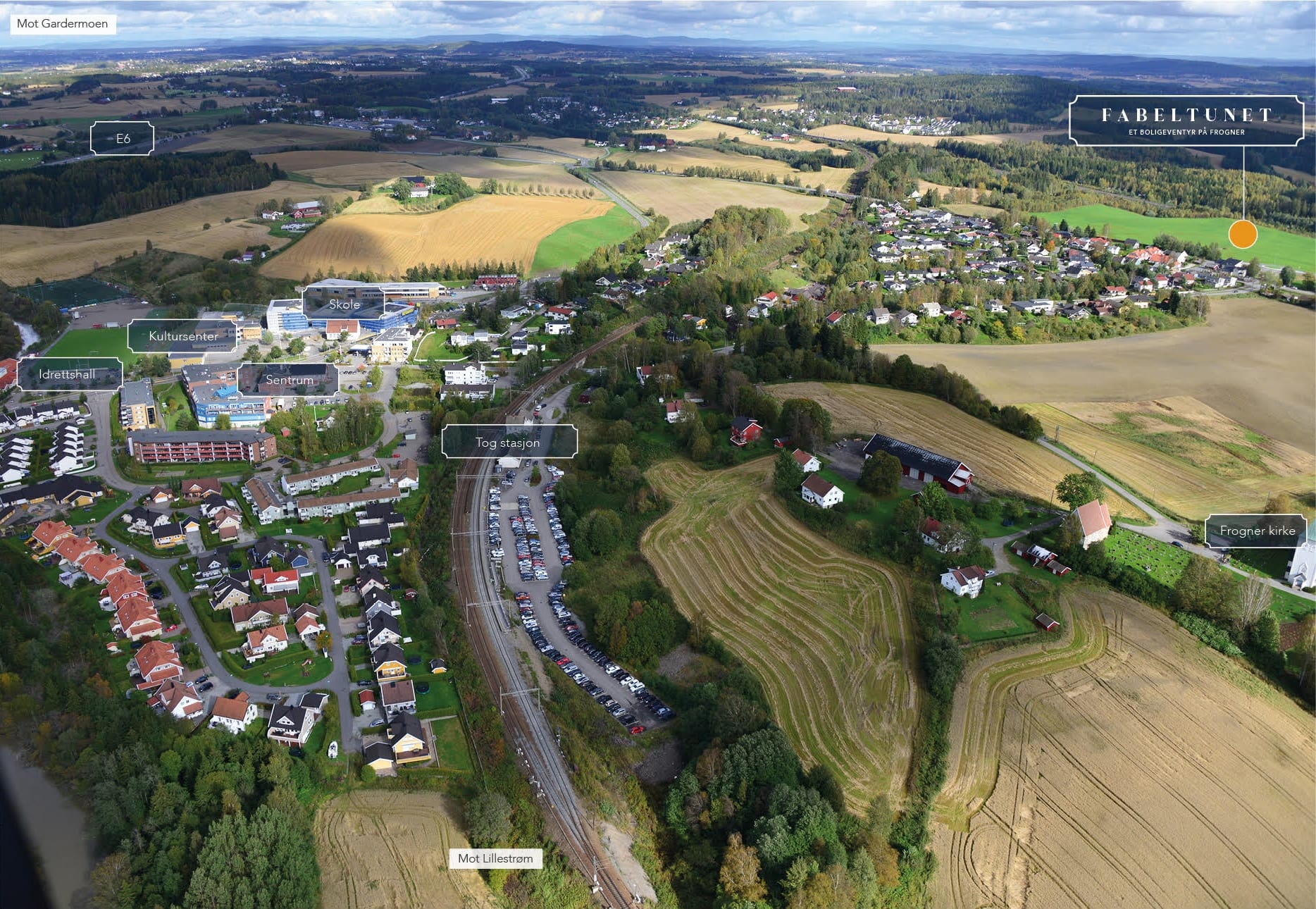 Område med spennende fremtid. Fabeltunet er perfekt for de som ønsker en lettstelt bolig i et idyllisk område. Område i kraftig vekst. En av grunnene til det er den gode togkommunikasjonen til Oslo. I tillegg har man tilgang til topp moderne skoler, barnehager samt et flott idrettsanlegg – alt ligger til rette for trivsel både for store og små.