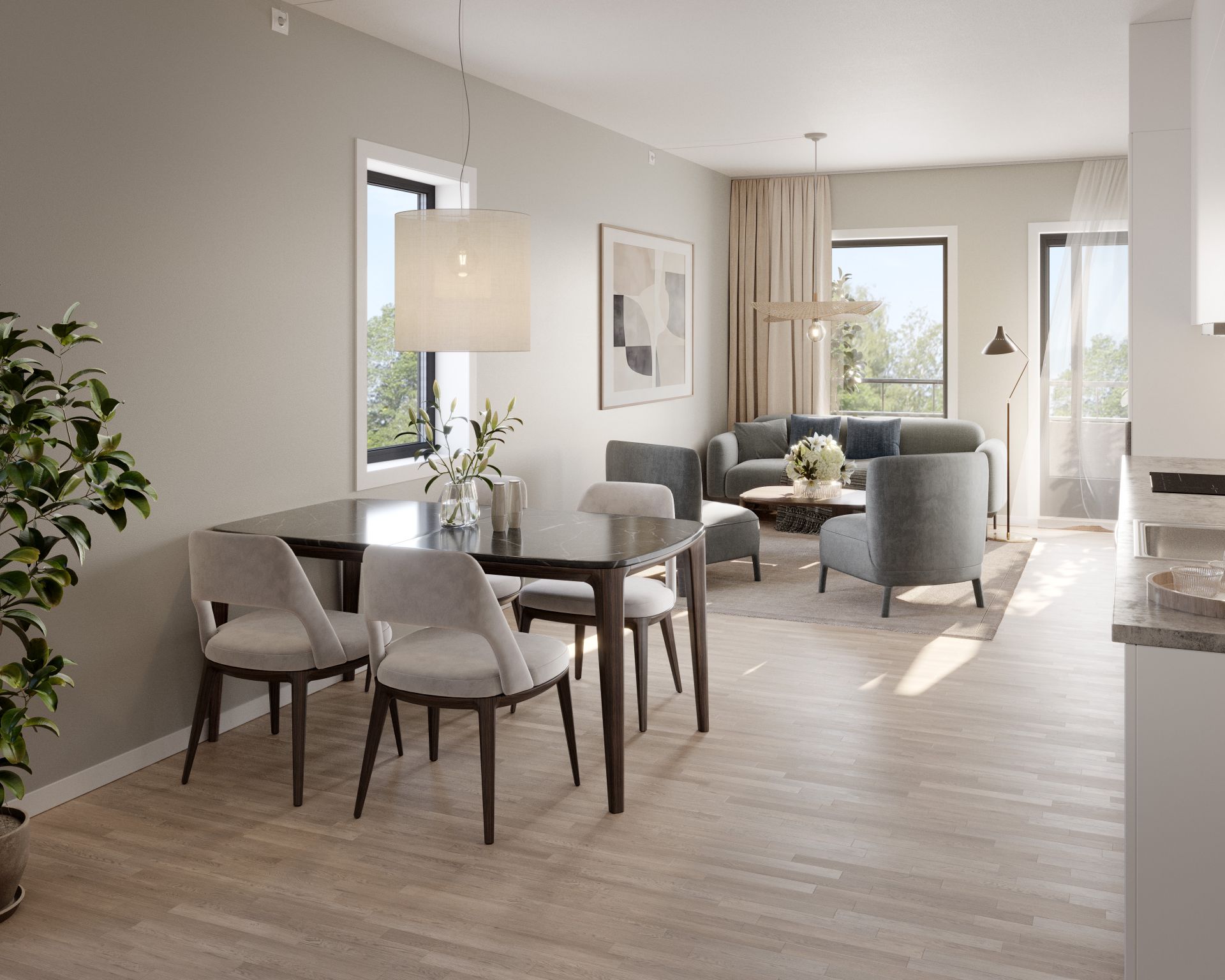 Flere av leilighetene har private balkonger eller markterrasser som gir en naturlig forlengelse av oppholdsrommet og fine uteplasser for både morgenkaffe og rolige ettermiddager. Gode lysforhold og gjennomtenkte vindusplasseringer bidrar til en lys og luftig romfølelse – også på færre kvadratmeter.