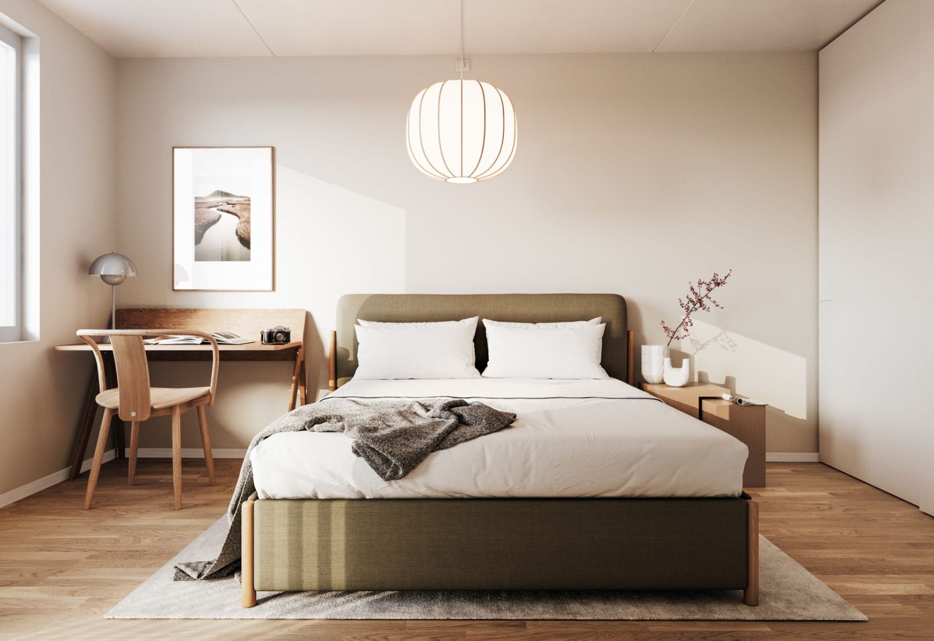 Det er de duse, rolige fargene som setter tonen for stilen i denne boligen. Kjøkkenet leveres med beige fronter (Vidde korn), en sandstensinspirert benkeplate og hvit veggfarge som gir et lyst og behagelig utgangspunkt. Helheten oppleves som varm, rolig og inviterende.