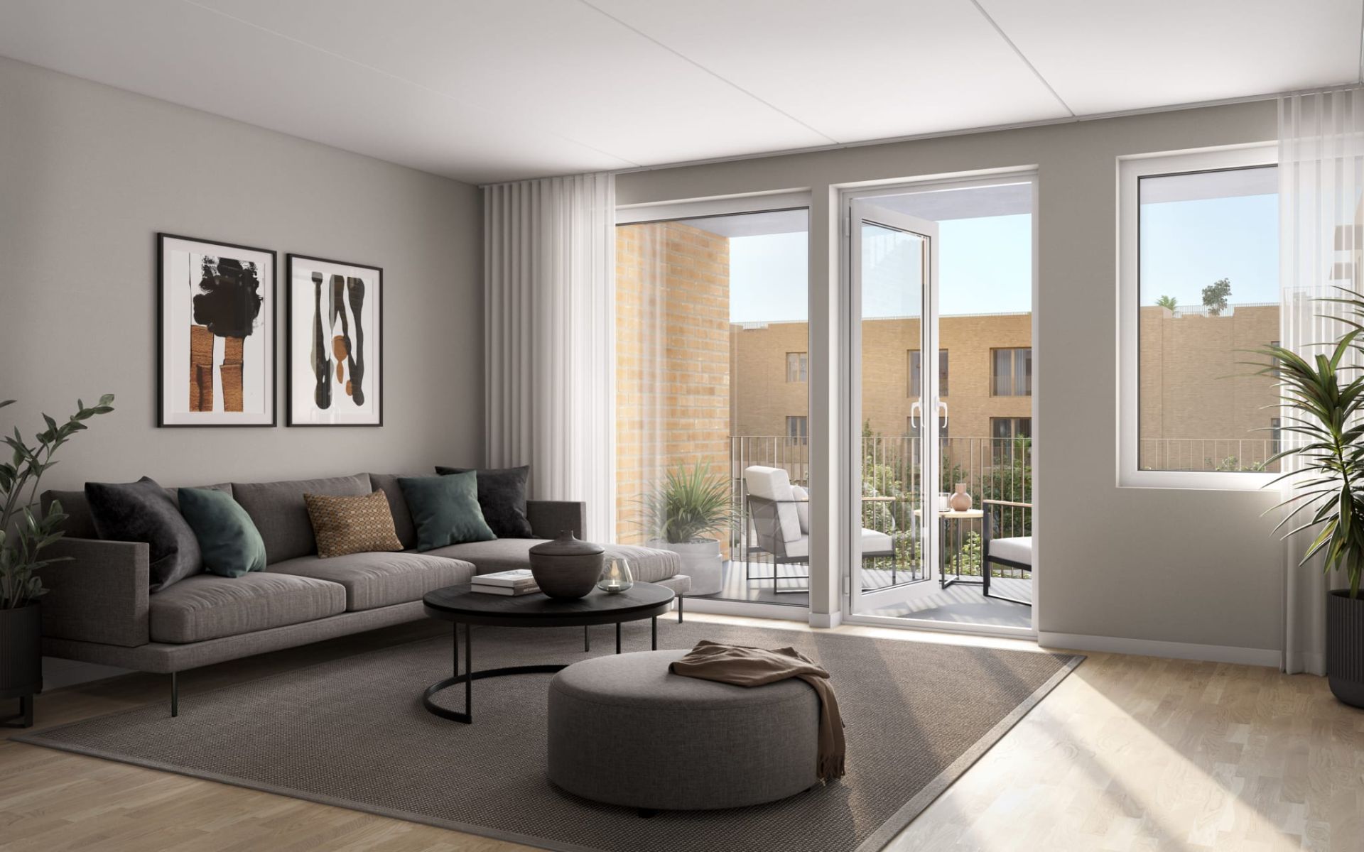 Et lunt og moderne hjem med beige fronter og sandstensbenkeplate. De lyse veggene gir god romfølelse, og planløsningen utnytter arealet effektivt. En leilighet som kombinerer funksjon, varme og stil på en naturlig måte.