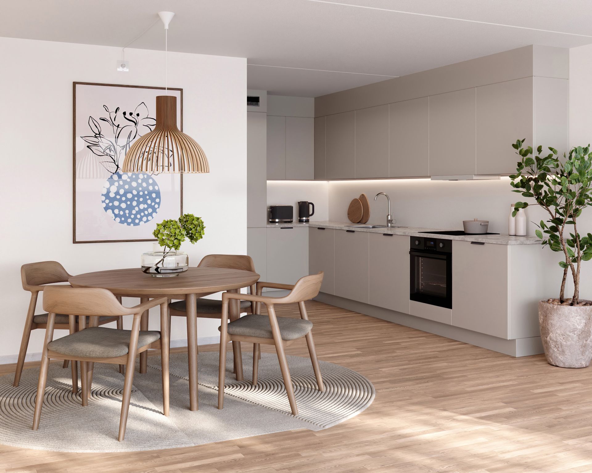 Et lunt og moderne hjem med beige fronter og sandstensbenkeplate. De lyse veggene gir god romfølelse, og planløsningen utnytter arealet effektivt. En leilighet som kombinerer funksjon, varme og stil på en naturlig måte.