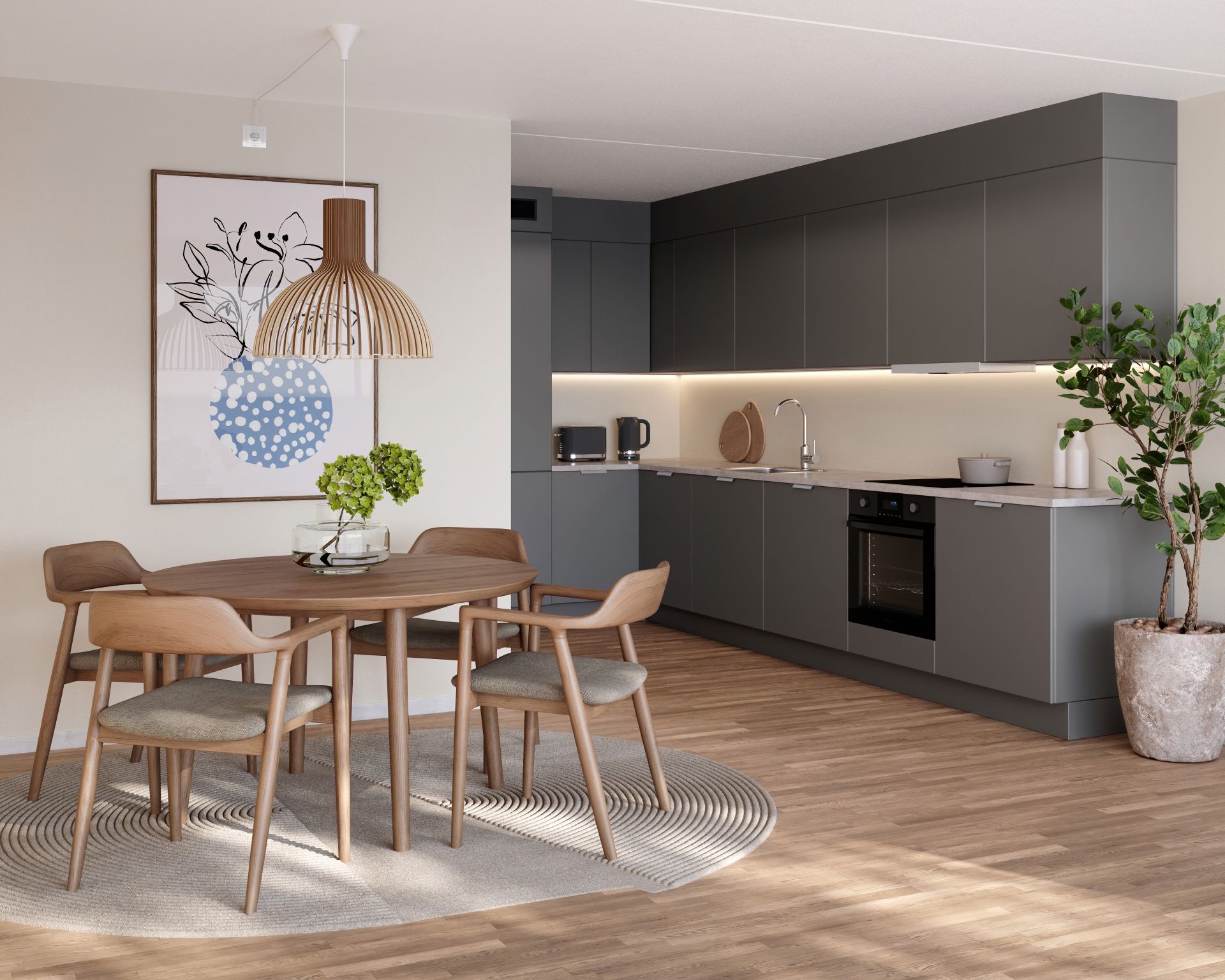 Med en kombinasjon av varme fargetoner og tidløse materialer vil denne stilen gi et elegant uttrykk som holder seg aktuelt år etter år. Kjøkkenet leveres med grå fronter (Vidde Granitt), en hvit Levanto-benkeplate og vegger malt i en dempet, varmgrå tone (Tidløs 1024).