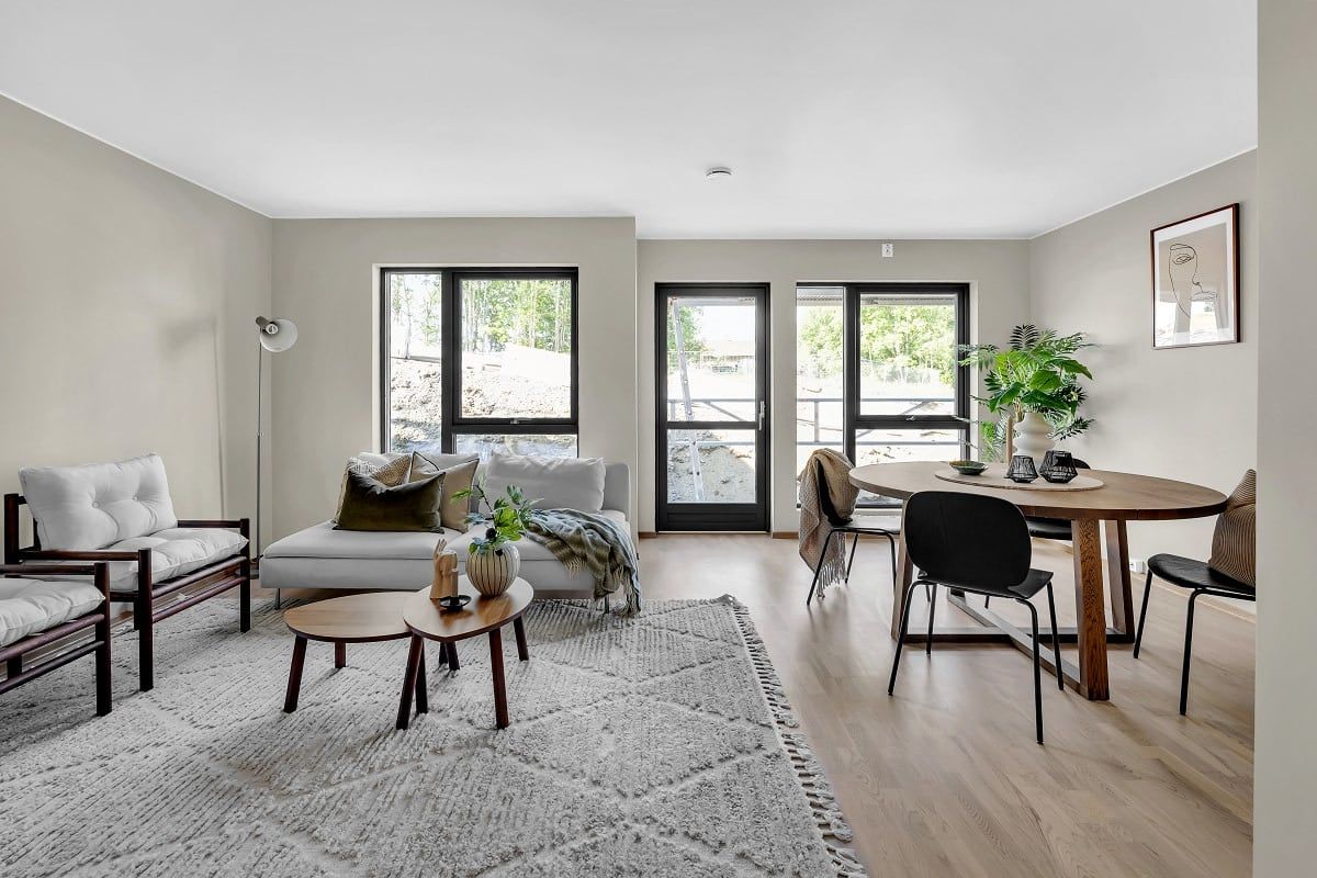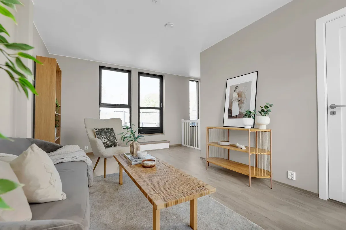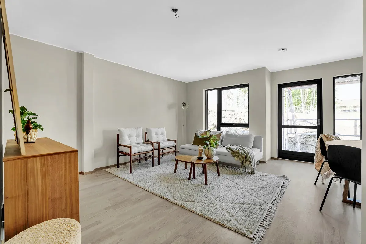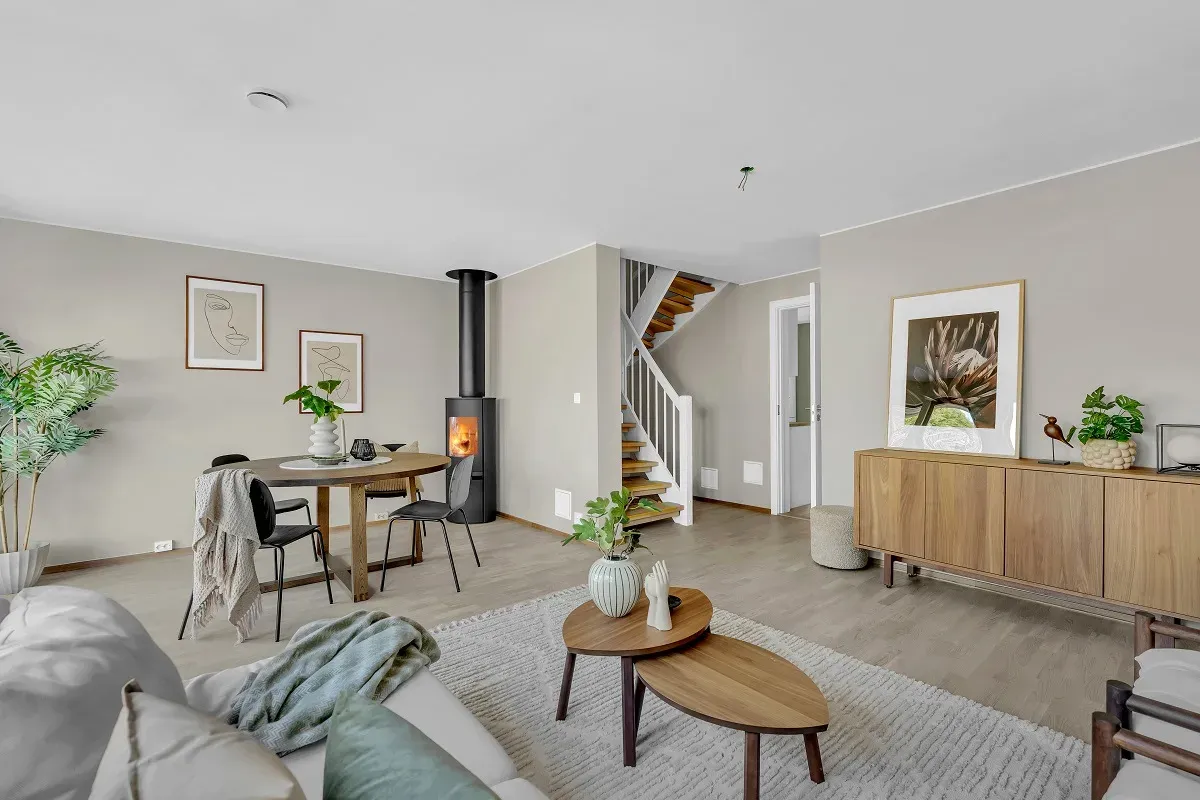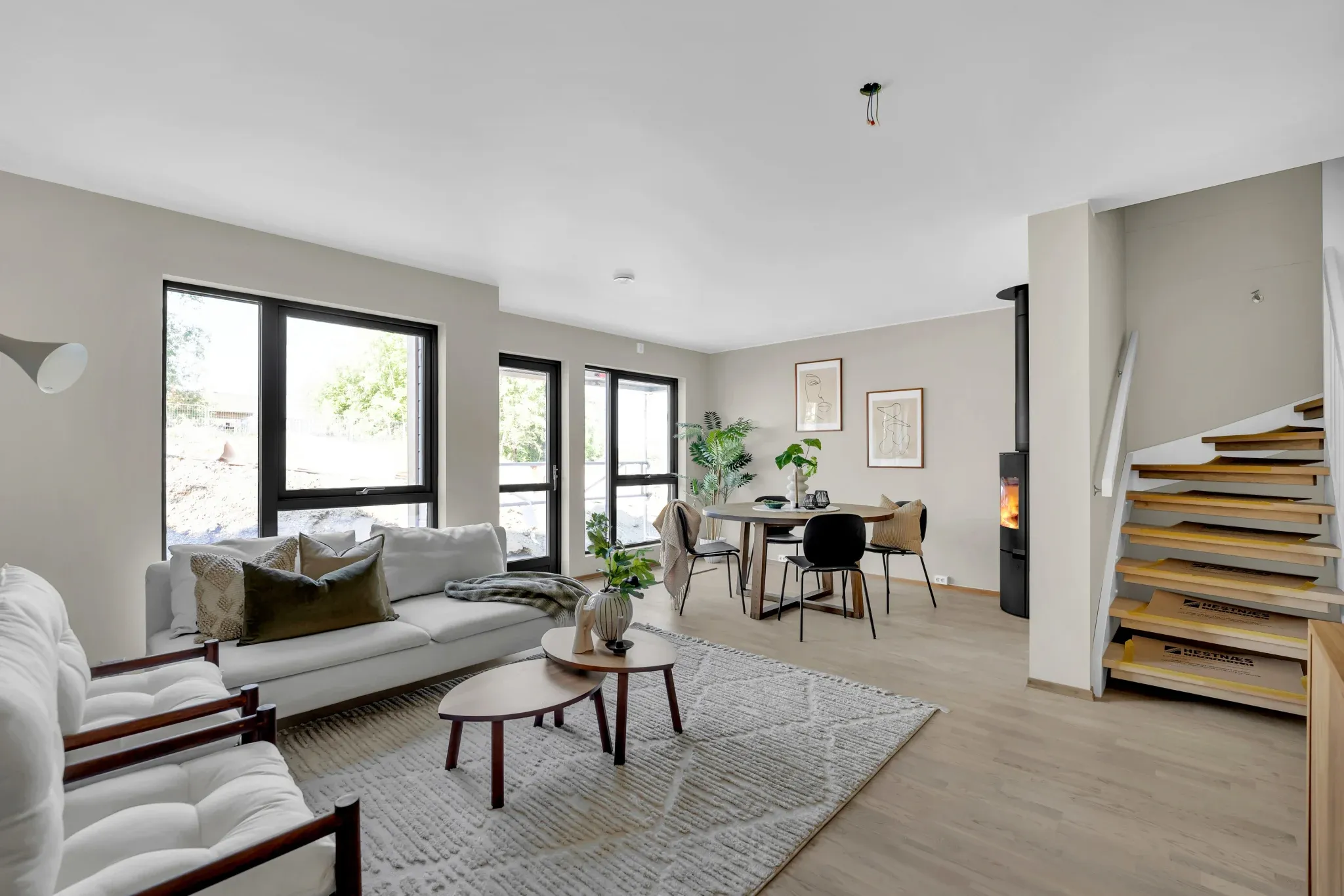 Vi har ikke en klar innredet bolig for øyeblikket her i Lørenfallet hage, men du kan se nærmere på en ferdigstilt bolig på de fine fotoene under. Dette er en tilsvarende bolig som 43 og 45 som er tilsalgs i nåværende stund. Disse har en flott, solrik beliggenhet på feltet.