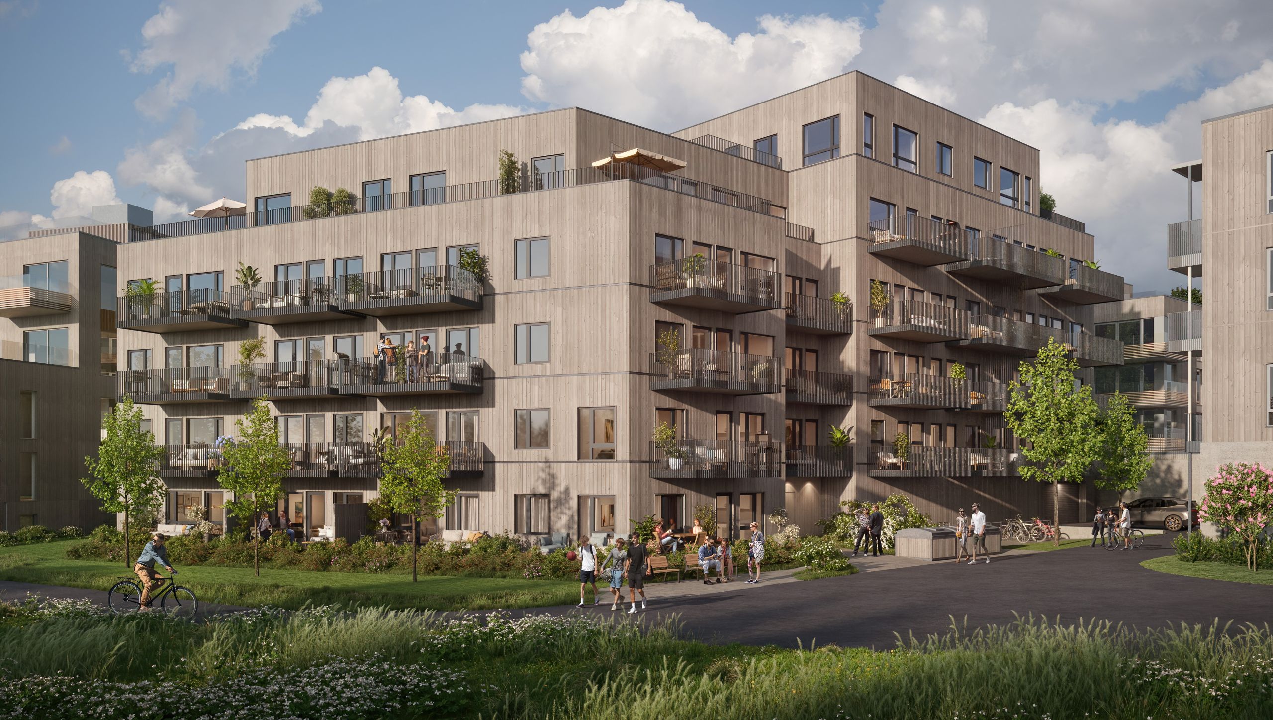 Alle leiligheter har private balkonger eller terrasser som gir fine uteplasser med gode solforhold, i tillegg til tilgang til felles fasiliteter som heis, garasjeanlegg og praktiske boder. Sammen skaper dette et trygt, funksjonelt og trivelig bomiljø – med nærhet til både hverdagsfunksjoner og møteplasser i sentrum.