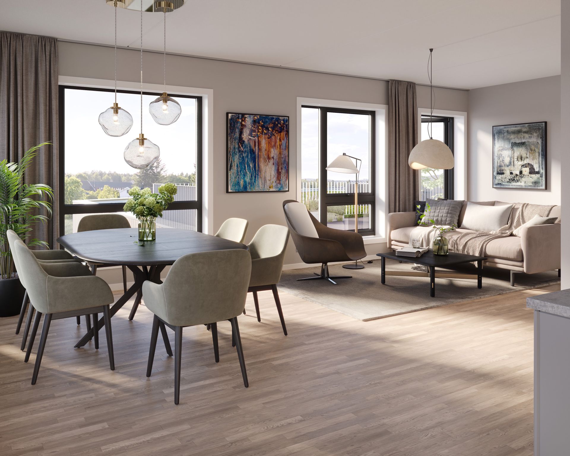 Leilighetene byr på romslige oppholdsrom med vannbåren gulvvarme og store vindusflater som gir godt med dagslys. Kjøkken fra HTH med integrerte hvitevarer gir et helhetlig og moderne uttrykk, samtidig som planløsningene gir plass til både spisebord og sofagruppe. Det ekstra rommet kan enkelt tilpasses som soverom, hjemmekontor eller hobbyrom.