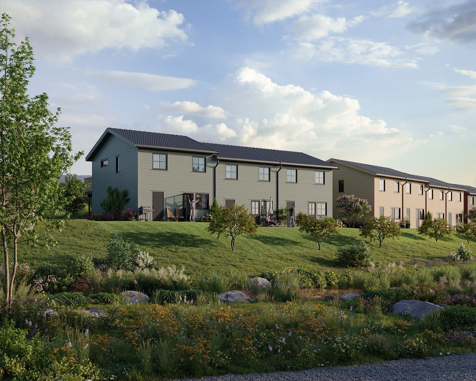 Rekkehusene får 3 soverom, lys stue med åpen kjøkkenløsning, privat, solrik og romslig uteplass – perfekt for både barnefamilier, par og deg som ønsker en praktisk og moderne bolig.