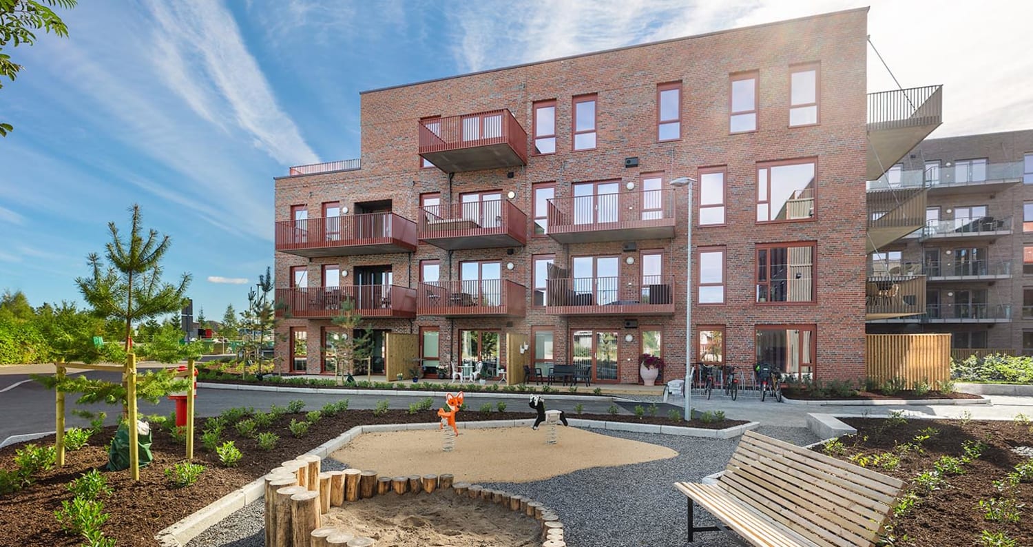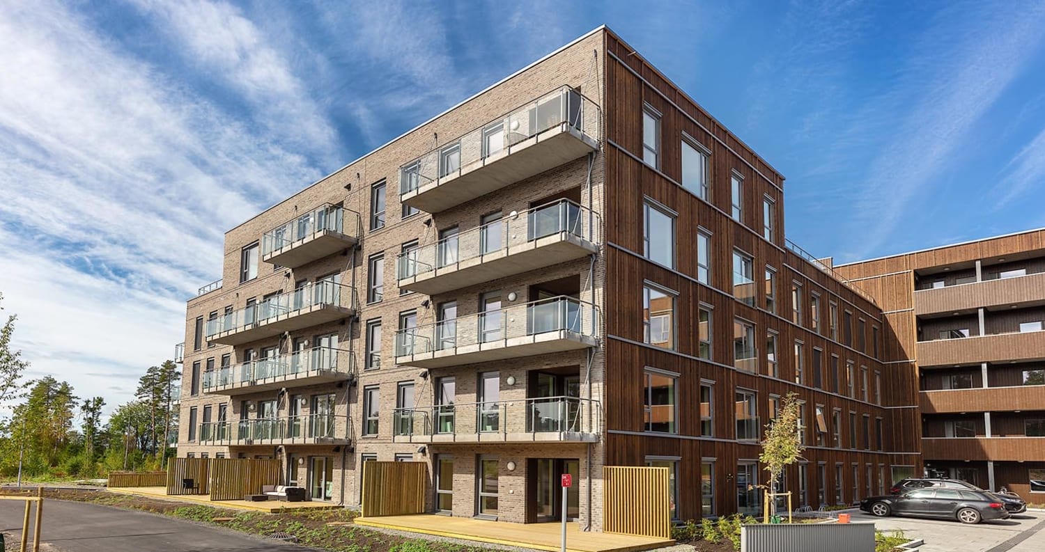 Gode, solide materialer som varer lenge er også med på å skape en ramme av stabilitet. Leilighetsbyggene i Skogmo Park blir av tegl, et materiale som ofte får en fin patina. Et inngangsparti som gir deg en blid hjemkomst er også viktig. Dette blir luftig og romslig med solide og gode materialer, brede dører med felt i glass som slipper inn dagslys. Et innbydende inngangsparti kan være et fint møtepunkt mellom naboer. Følelsen av luft og soliditet trekkes videre innover i korridorene, de er brede og skaper fin romfølelse.